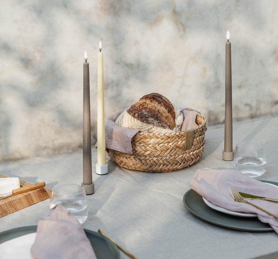 Sophisticated and modern, this aesthetic is grounded in calming neutrals, with a unique accent as the focal point. For the centerpiece, we’ve chosen the Mocha Swirl Coastal Bowl, made of food-safe resin with a stunning swirl pattern in brown, cream, and orange. The Utility Jug and Highball Glasses in amber offer simple elegance, while the gold-plated Small Host Bowl is a stylish vessel for sauces, herbs, or seasonings. Add a pleasant ambiance with some LED taper candles in taupe, or if dining outdoors, light up your night with the Portable Outdoor Lamp in beige.