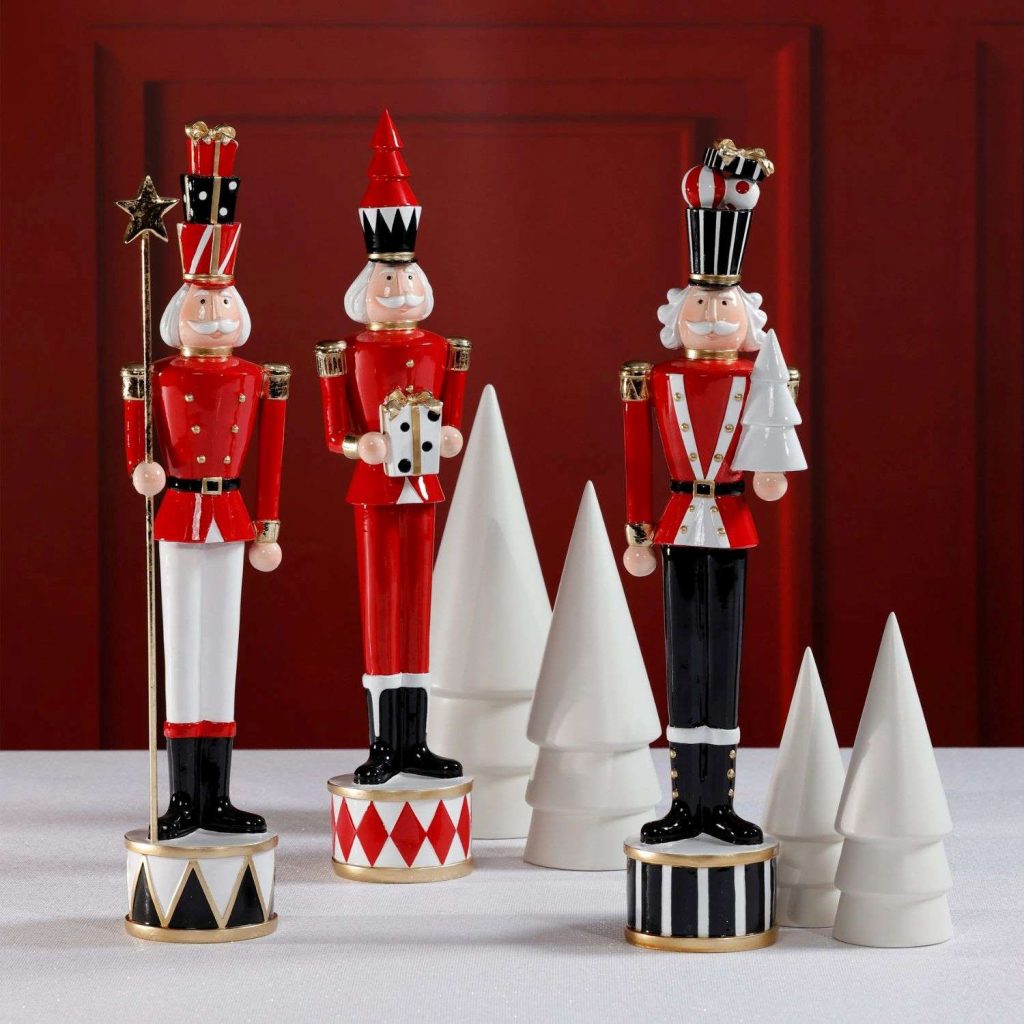 For example, the Twinkle Troop figurines are a great centerpiece for a more traditional tablescape. “These nutcrackers in shiny red bring in an updated bit of old-world elegance,” says Milk. They pair well with the Pearl White Deer, whose lustrous finish adds a touch of sophistication. If a minimalist tablescape is more your style, consider a couple of Snowman Figurines paired with the simplified silhouettes of the White Christmas Tree and Narrow White Tree for a look that is low-key yet artful.