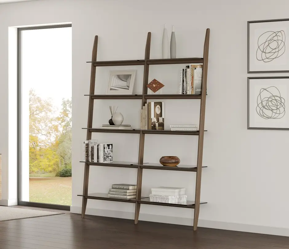 Searching for shelves with a bolder look? Check out Eileen or Stiletto, both with tinted glass and an undeniably modern slanted design. The Eileen has a rectangular frame, while the Stiletto has a more open “ladder” shape. Sturdy construction ensures these shelves lean securely against your wall, or you can anchor the Eileen in place with added hardware for extra peace of mind. Both these shelves are a beautiful choice to display favorite books and prized possessions. Eileen available in walnut, chocolate, charcoal, or white. Stiletto in walnut only.