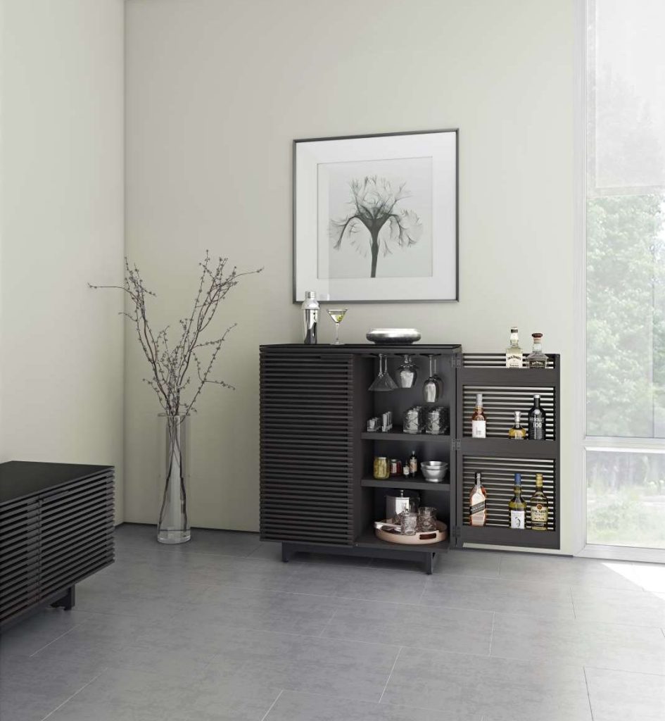 Avella recommends a bar cabinet as the foundation of your home bar, since bar cabinets are specifically built with features that make it easy to store and serve drinks. “It can also be a wonderful conversation piece when you have guests over,” she adds. “For instance, BDI’s Corridor Bar has a dramatic louvered front that is perfect for a modern home.” An award-winning design, Corridor is equipped with a wealth of functional elements – from wine storage and a stemware rack to adjustable shelving and a satin-etched glass top that resists scratches and spills.