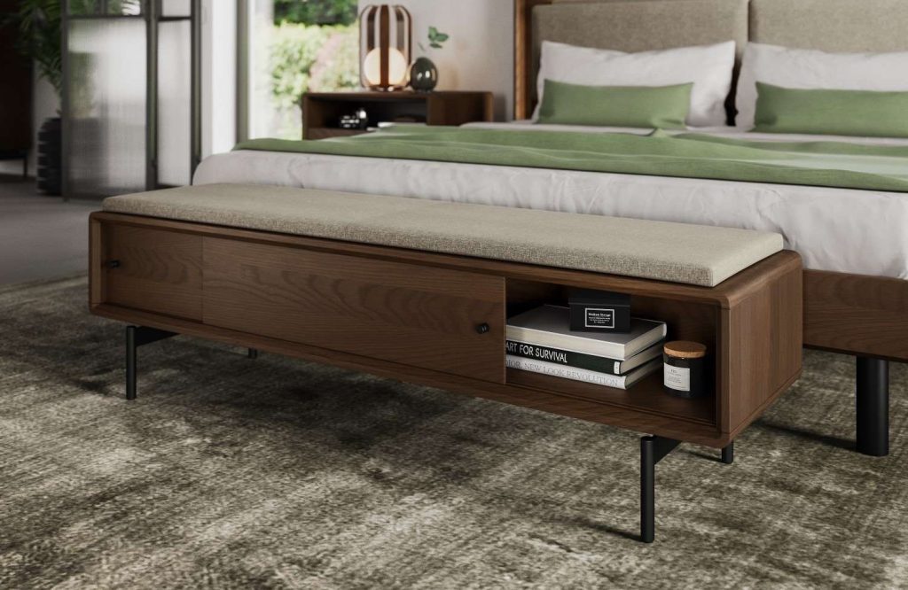 Erickson also emphasizes the variety of accent furnishings available for guest rooms of all sizes: “It’s nice to have a place to sit and tie your shoes or to place a suitcase on to unpack – the Linq bench can easily be set at the foot of a bed and comes with handy interior storage.” For larger rooms, a comfortable chair is perfect for inviting your guests to relax or crack open a book. You could also incorporate a compact desk like Bella Clara to provide workspace.” A desk can also provide storage space, making it a great multifunctional choice.