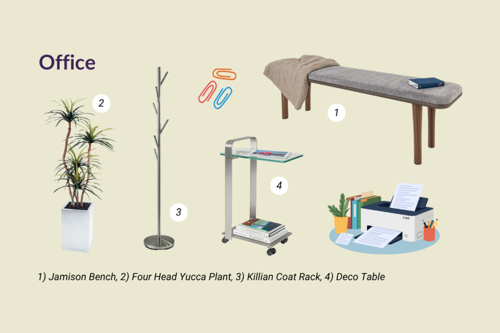 Coordinate your office bench with a functional side table like Deco – its top and bottom tiers offer space for a curated stack of magazines or a bowl of candy, while its rolling base allows for easy movement around the office. A minimalist coat rack like Killian is a thoughtful touch for clients who want to hang up their coats before settling down to talk. Add some nature with a houseplant or a faux arrangement like the Four Head Yucca, and you’re set.