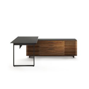 L-shaped Desk – Maximize your workspace with an L-shaped desk, which provides ample surface area and is ideal for configuring around a corner placement. Choose an L-shaped desk with built-in storage, or build your own by adding a return desk onto a computer or executive desk. Or, if you are working with a modular desk and storage collection like the Sequel 20 by BDI, create an L-shaped space by placing a credenza or multifunction cabinet perpendicular to the desktop. Additionally, L-shaped workspaces are incredibly versatile for efficient storage solutions, as mobile file pedestals can be neatly tucked underneath to store files and valuables.