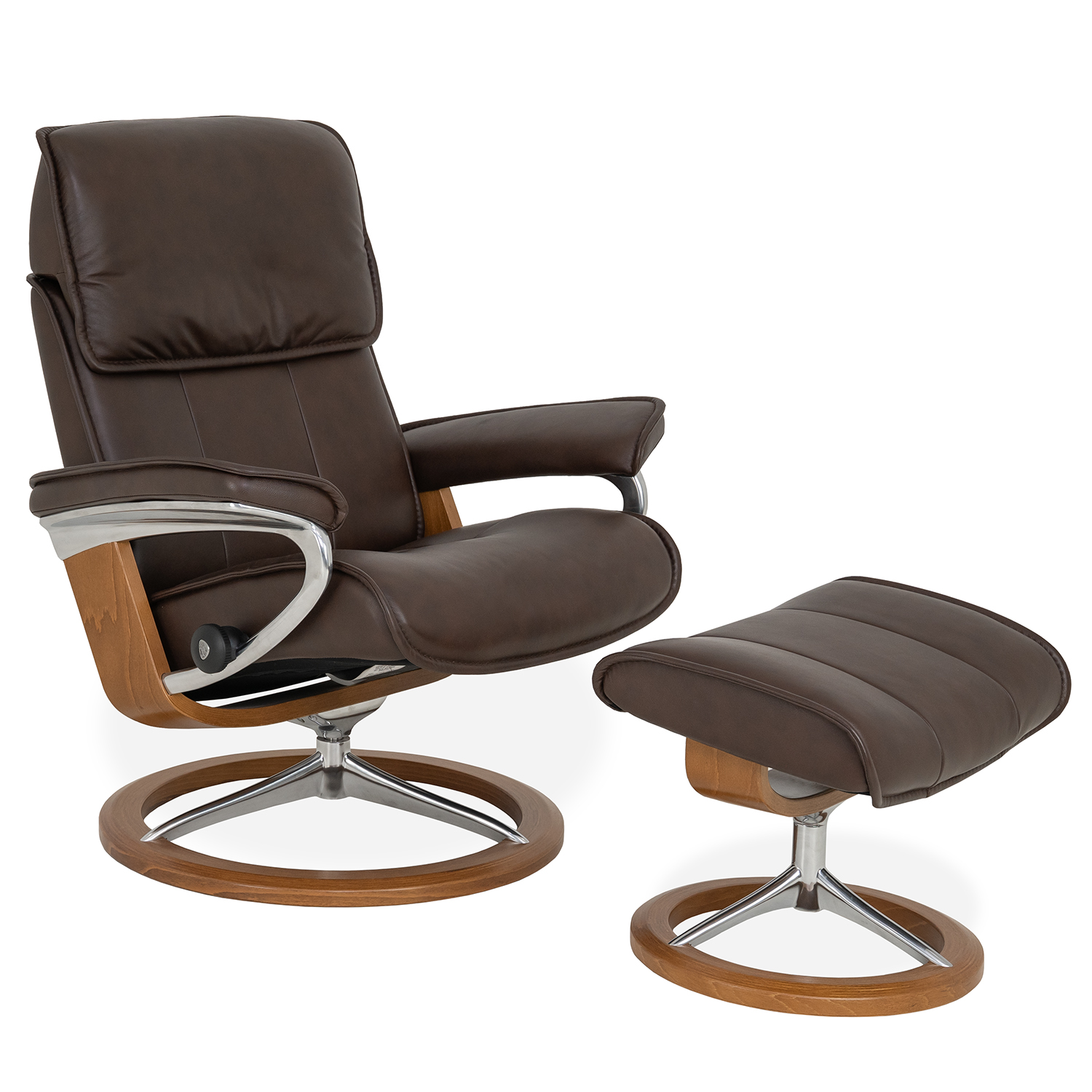The Admiral Large Chair & Ottoman, designed by Ekornes of Norway, has a classic design with cutting edge comfort technology. Available with a signature teak base and chocolate Paloma leather upholstery, this piece provides full-body support, with an ample pillow-like headrest, and matching stitching. Admiral is equipped with Stressless® Plus™ and Glide Systems, which allow the chair to provide continous support for the head and lower back, while also adjusting the reclining angle base on shifts of the body. The Signature base brings the comfort of the BalanceAdapt™ system, which equips the chair with a gentle rocking motion to adjust with shifts in body position.