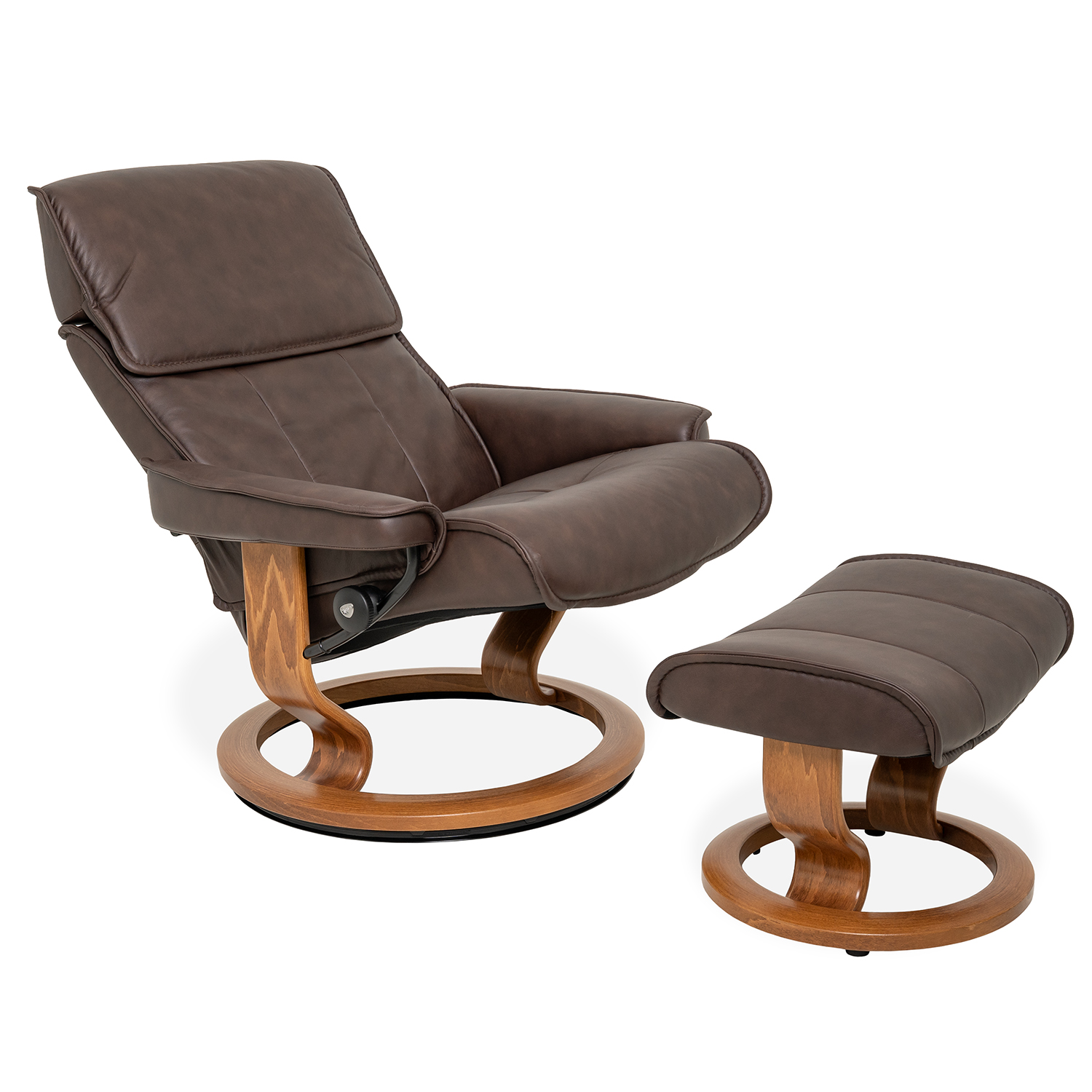 The Admiral Medium Chair and Ottoman, designed by Ekornes of Norway, has a classic design with cutting edge comfort technology. Available with a classic teak base and chocolate Paloma leather upholstery, this piece provides full-body support, with an ample pillow-like headrest, and matching stiching. Admiral is equipped with Stressless® Plus™ and Glide systems, which allow the chair to provide continuous support for the head and lower back, while also adjusting the reclining angle based on shifts of the body.