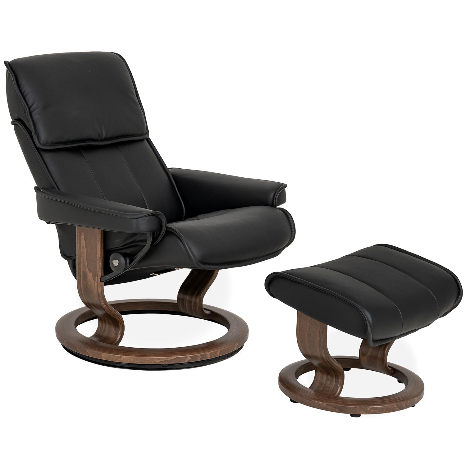 The Admiral Medium Chair and Ottoman, designed by Ekornes of Norway, has a classic design with cutting edge comfort technology. Available with a classic teak base and black Paloma leather upholstery, this piece provides full-body support, with an ample pillow-like headrest, and matching stiching. Admiral is equipped with Stressless® Plus™ and Glide systems, which allow the chair to provide continuous support for the head and lower back, while also adjusting the reclining angle based on shifts of the body.