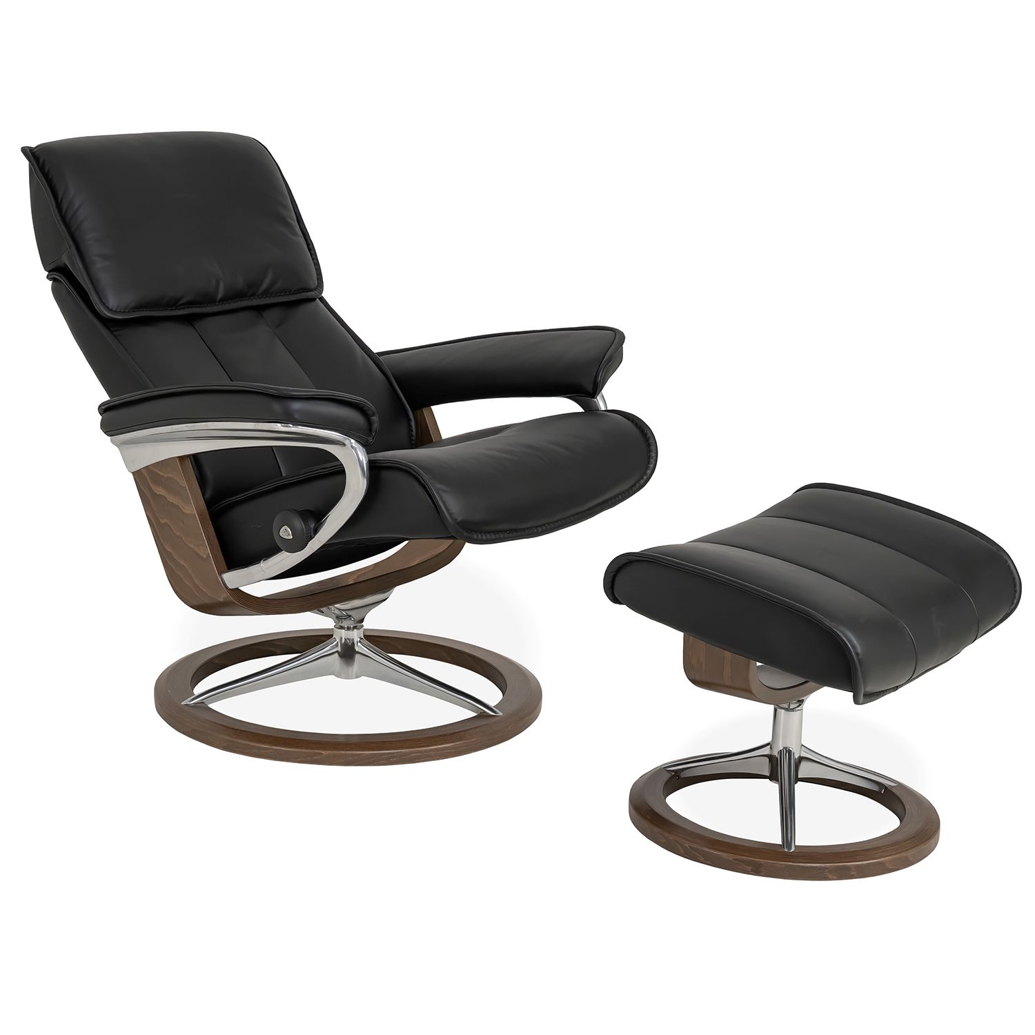 The Admiral Medium Chair & Ottoman, designed by Ekornes of Norway, has a classic design with cutting edge comfort technology. Available with a signature walnut base and black Paloma leather upholstery, this piece provides full-body support, with an ample pillow-like headrest, and matching stitching. Admiral is equipped with Stressless® Plus™ and Glide Systems, which allow the chair to provide continous support for the head and lower back, while also adjusting the reclining angle based on shifts of the body. The Signature base brings the comfort of the BalanceAdapt™ system, which equips the chair with a gentle rocking motion to adjust with shifts in body position.