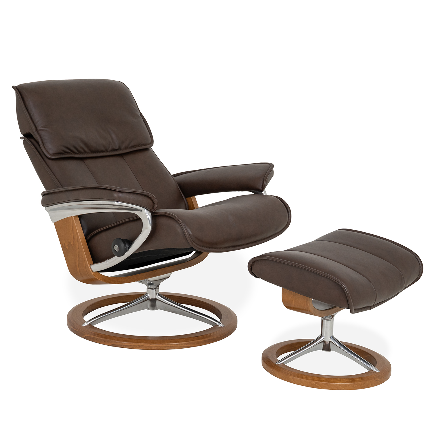 The Admiral Medium Chair & Ottoman, designed by Ekornes of Norway, has a classic design with cutting edge comfort technology. Available with a signature teak base and chocolate Paloma leather upholstery, this piece provides full-body support, with an ample pillow-like headrest, and matching stitching. Admiral is equipped with Stressless® Plus™ and Glide Systems, which allow the chair to provide continous support for the head and lower back, while also adjusting the reclining angle based on shifts of the body. The Signature base brings the comfort of the BalanceAdapt™ system, which equips the chair with a gentle rocking motion to adjust with shifts in body position.
