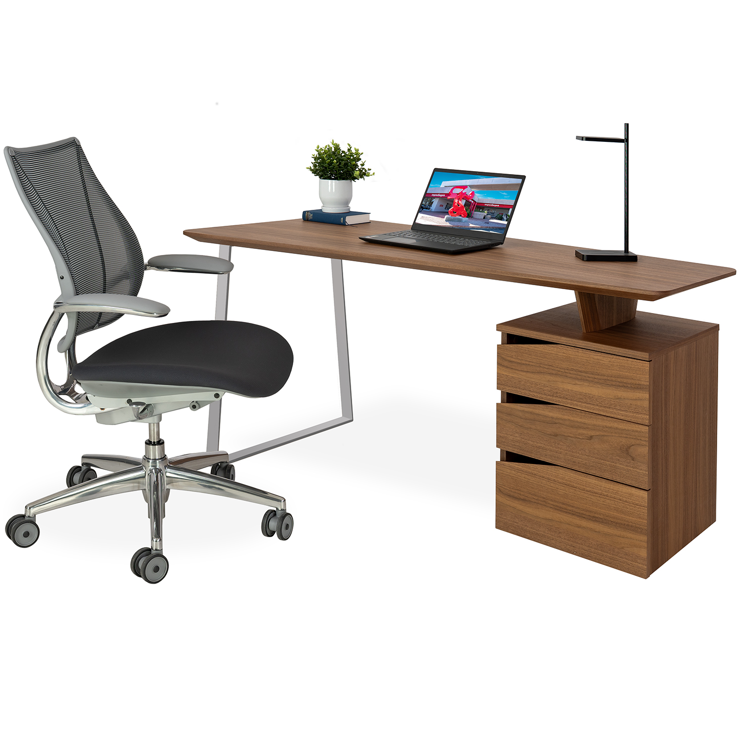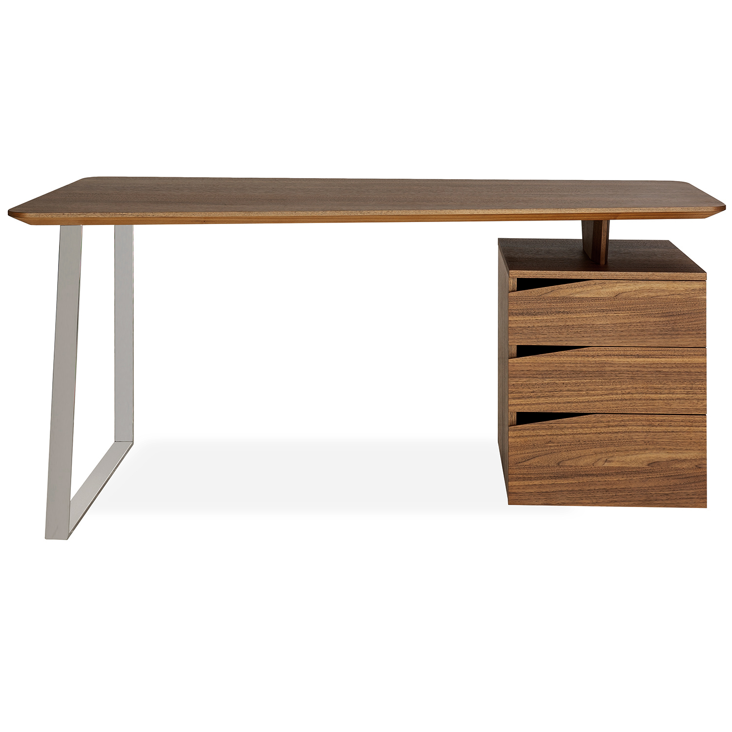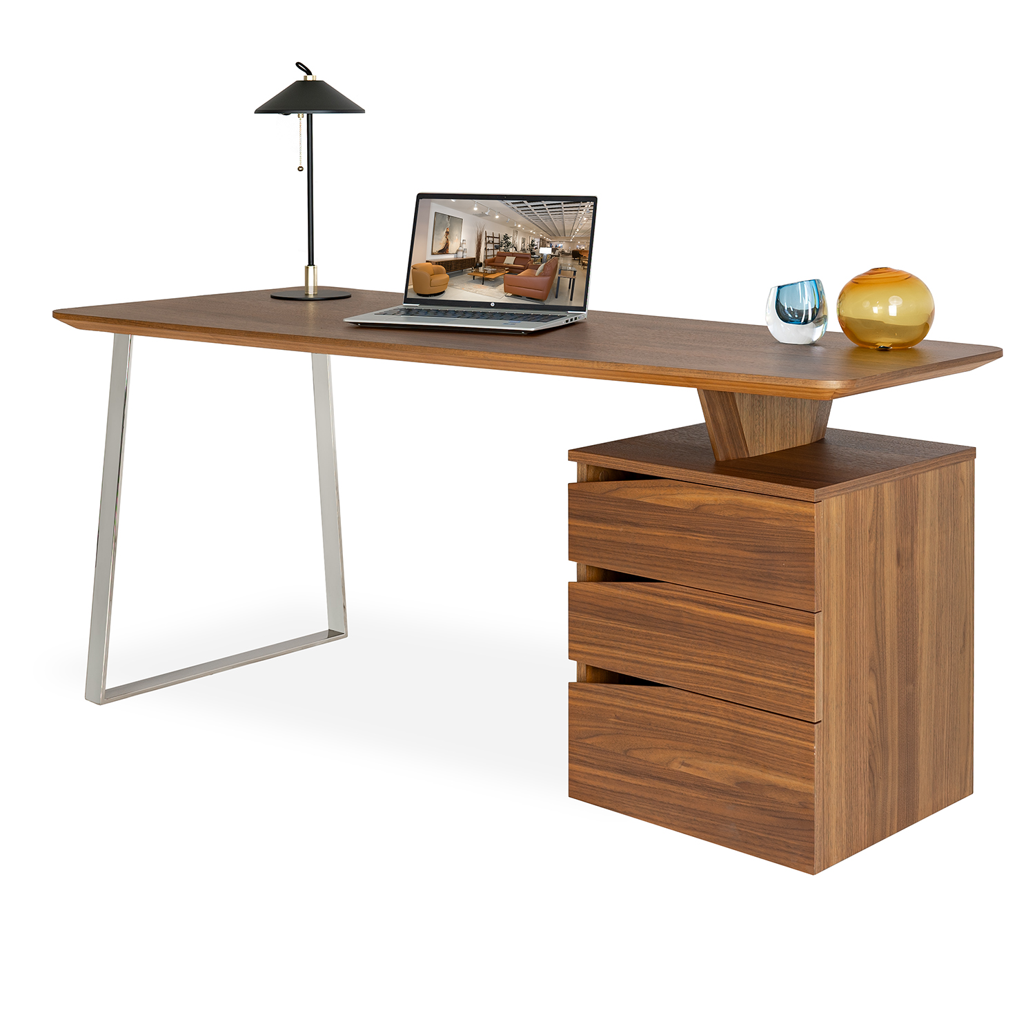 The Adrian Desk is stylish and contemporary, with an asymmetrical walnut desktop and one chrome leg. Three drawers offer convenient storage space for items you need to keep close at hand, and the angled cutout handles make the drawers easy to access while adding flair. With its attractive features and warm walnut finish, the Adrian Desk will look at-home in a wide variety of office spaces.