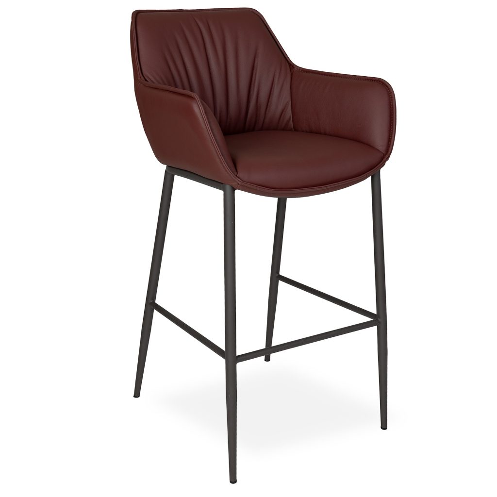 [0] => The Anita Barstool features a rounded shell design that curves in to form cradled arms and a gently-sloped seat. Upholstered in soft plum leather, Anita features accent stitching on the seat, back, and arms that adds a tailored finish, as well as a metal base formed by four cappuccino brown angled legs. Subtly playful and effortlessly comfortable, Anita will add instant style to your bar setup.