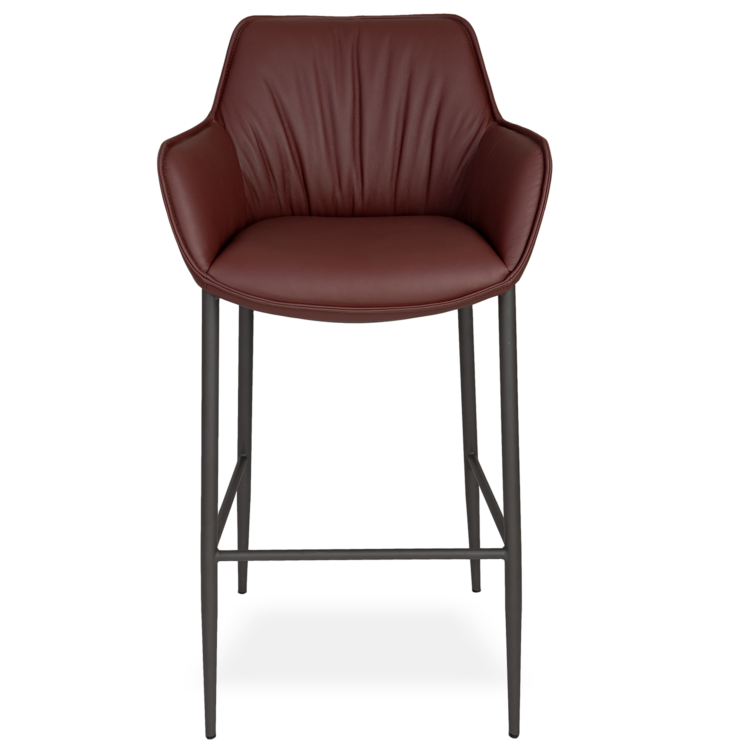 The Anita Barstool features a rounded shell design that curves in to form cradled arms and a gently-sloped seat. Upholstered in soft plum leather, Anita features accent stitching on the seat, back, and arms that adds a tailored finish, as well as a metal base formed by four cappuccino brown angled legs. Subtly playful and effortlessly comfortable, Anita will add instant style to your bar setup.
