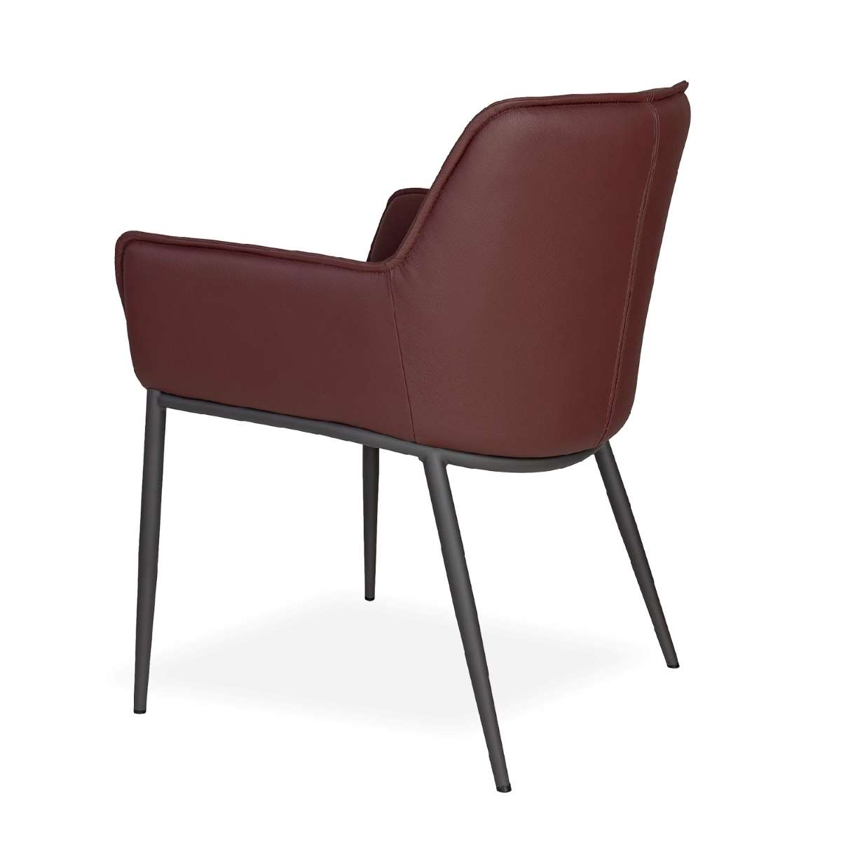 [0] => The Anita Dining Chair features a rounded shell design that curves in to form cradled arms and a gently-sloped seat. Upholstered in soft plum leather, Anita features accent stitching on the seat, back, and arms that adds a tailored finish, as well as a metal base formed by four cappuccino brown angled legs. Subtly playful and effortlessly comfortable, Anita will add instant style to your dining space.