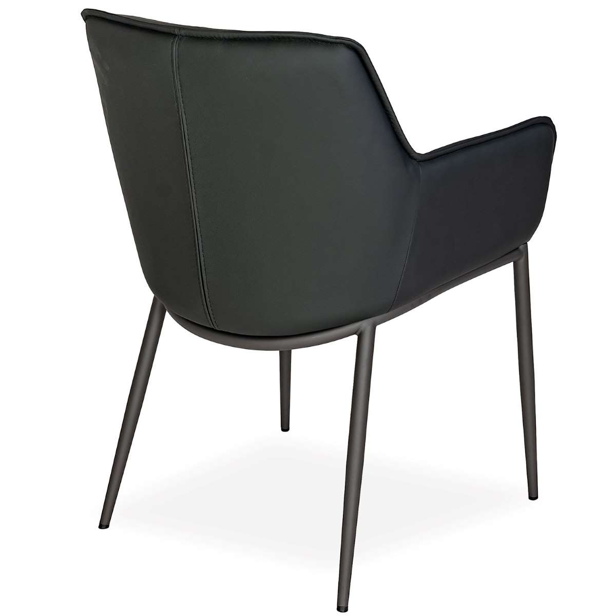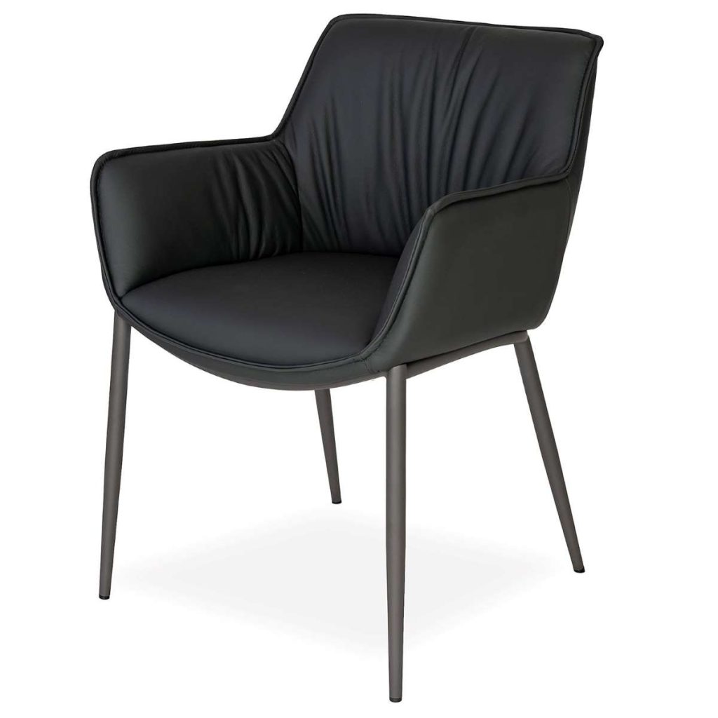 The Anita Dining Chair features a rounded shell design that curves in to form cradled arms and a gently-sloped seat. Upholstered in soft black leather, Anita features accent stitching on the seat, back, and arms that adds a tailored finish, as well as a metal base formed by four cappuccino brown angled legs. Subtly playful and effortlessly comfortable, Anita will add instant style to your dining space.