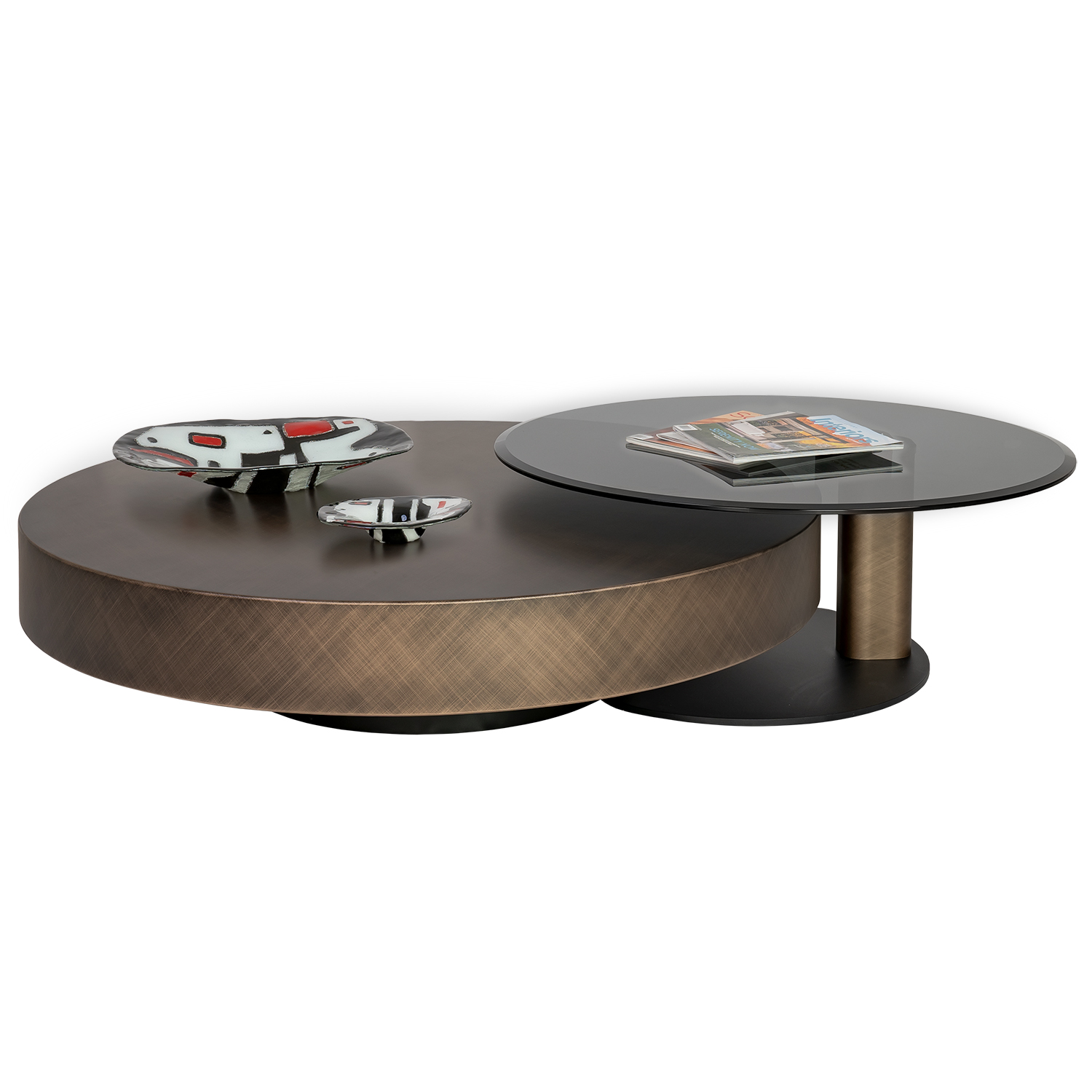 Add a statement piece to your living space with the Arena Bond Coffee Table by Cattelan Italia. Made in Italy, Arena is a tour de force, with a brushed bronze table flanked by a smaller revolving top in fumé glass. The overlapping structure of this coffee table is softened by complementary elements, with the brushed bronze column of the side table matching the larger tabletop, as well as both featuring coordinating black-embossed steel bases. Arena is eye-catching and spacious, creating the perfect centerpiece for any type of social occasion.