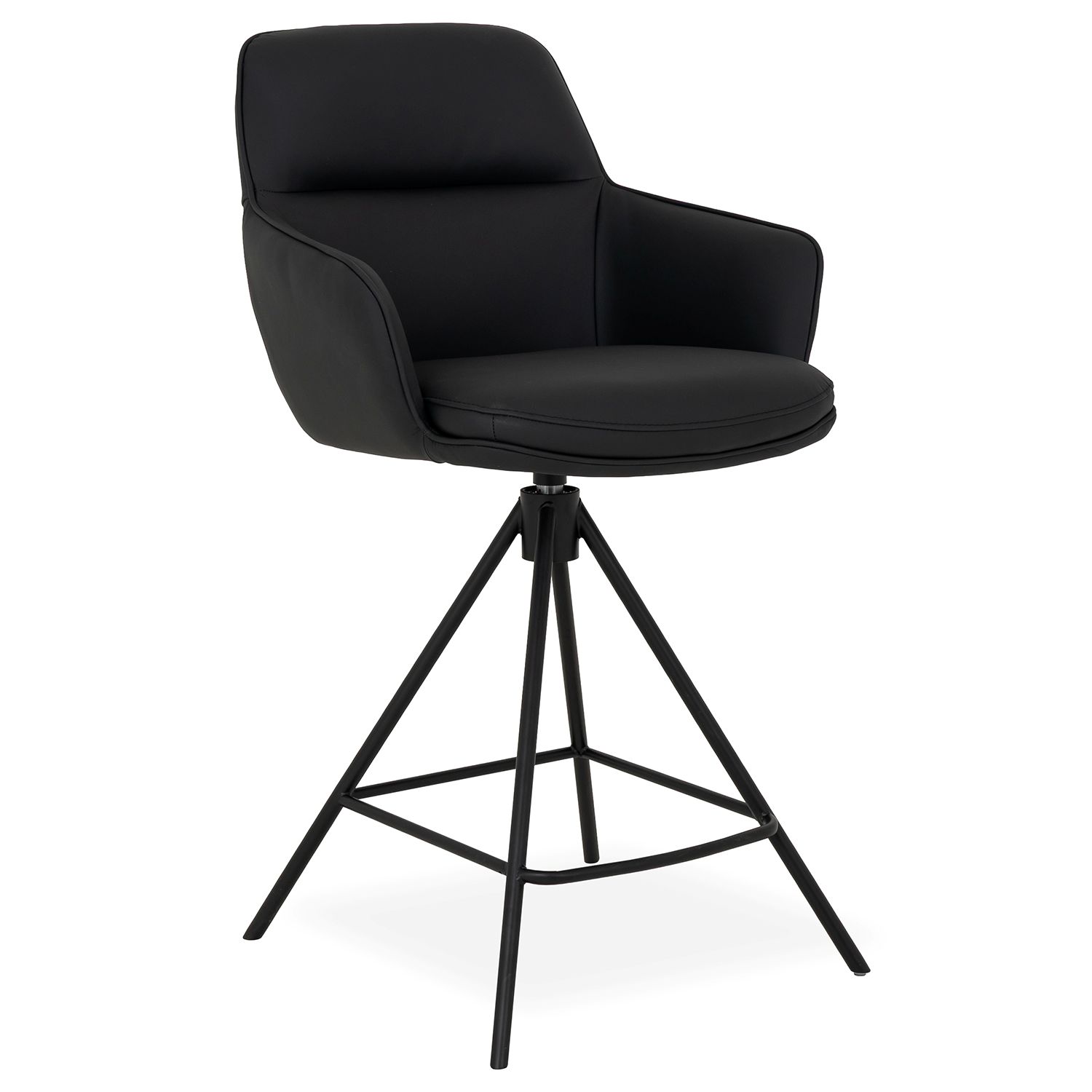 Designed in Italy, the Aris Counter Stool features soft black leather upholstery and a gently rounded shape. The seat is accented with piped stitching and a decorative zipper on the back, supported by four slim legs that angle outward for a modern silhouette. Both stylish and functional, Aris is equipped with a 360-degree swivel function and return mechanism, which allows the seat to rotate back to its default front-facing position.