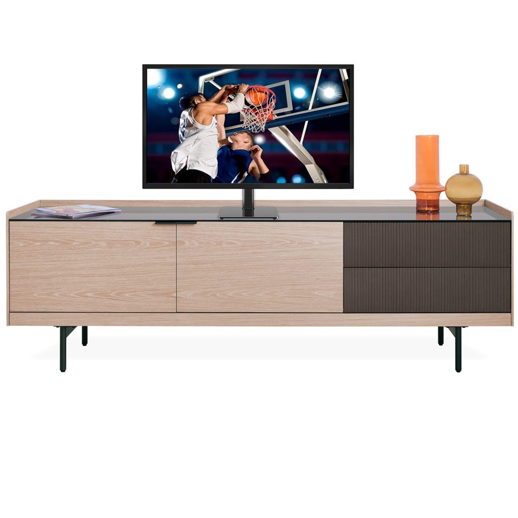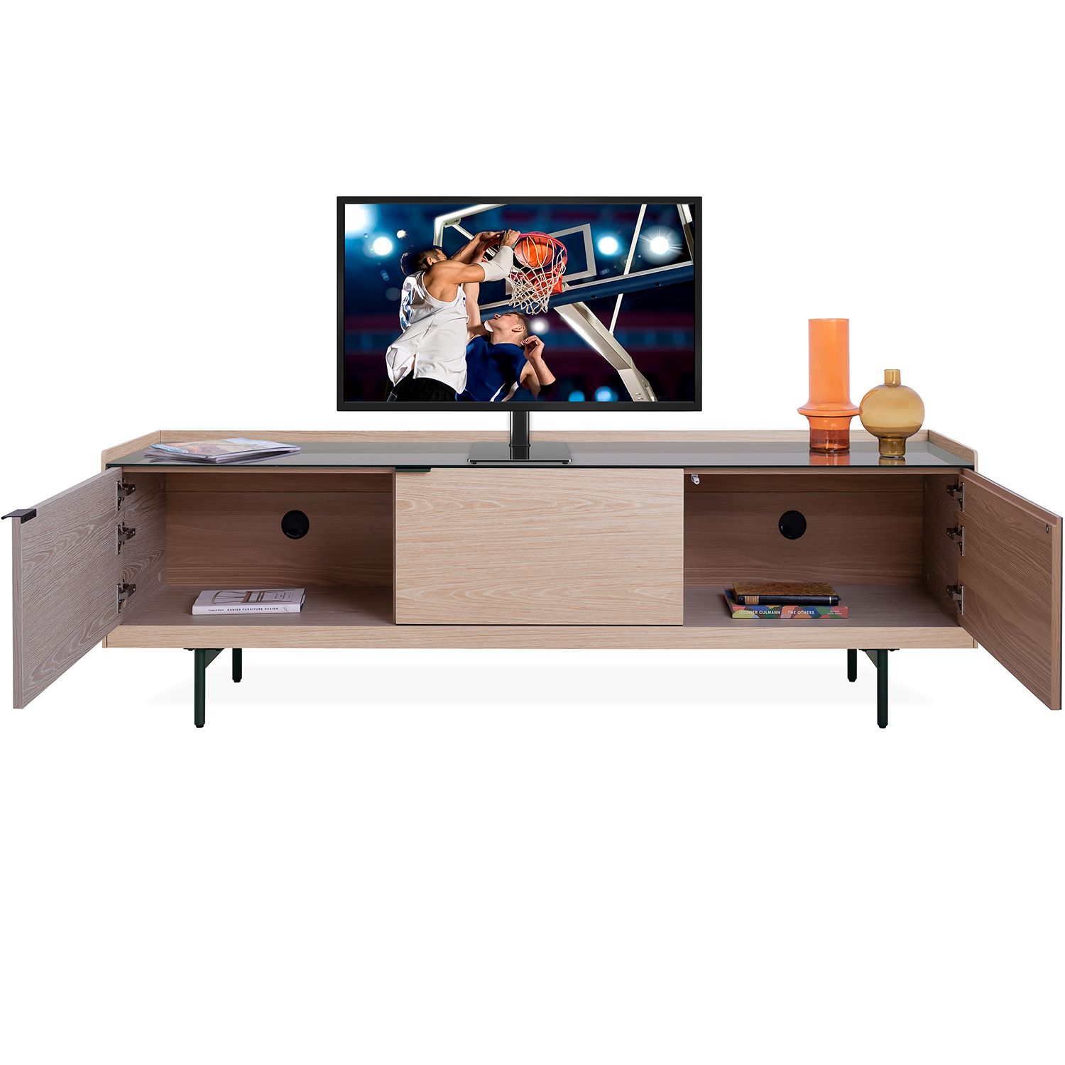 The Ashby TV Stand combines contrasting materials and textures to achieve a stylish blend of sleekness and warmth. Ashby's light oak veneered wood structure supports a brown glass tabletop, with three cabinets below to aid in organizing your media setup. The right-side cabinet door features a brown lacquered front whose textured vertical ridges form a pleasing contrast to the horizontal grain of the wood. Cable management ports and raised edges on the sides and back of the tabletop further contribute to Ashby's functional yet striking design.