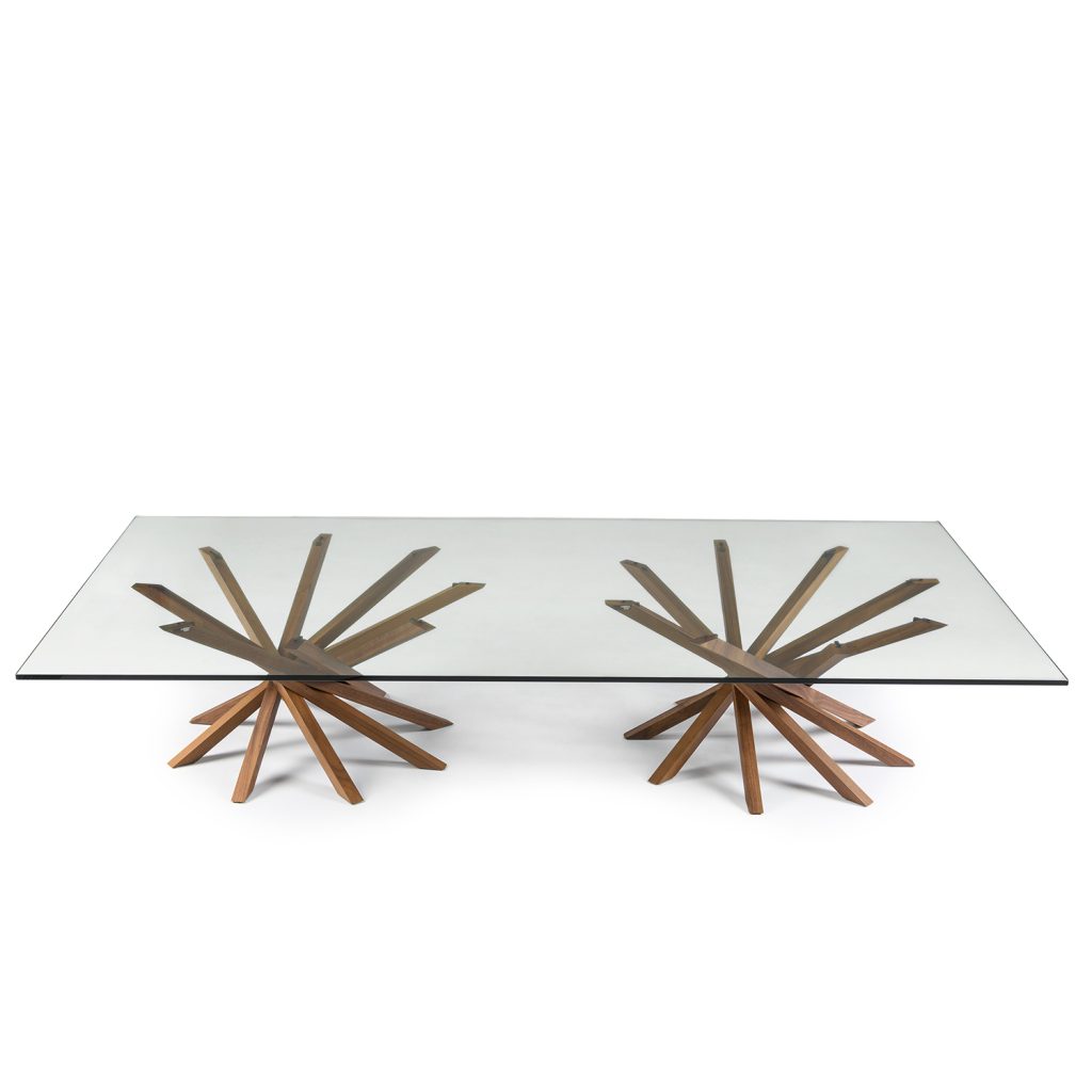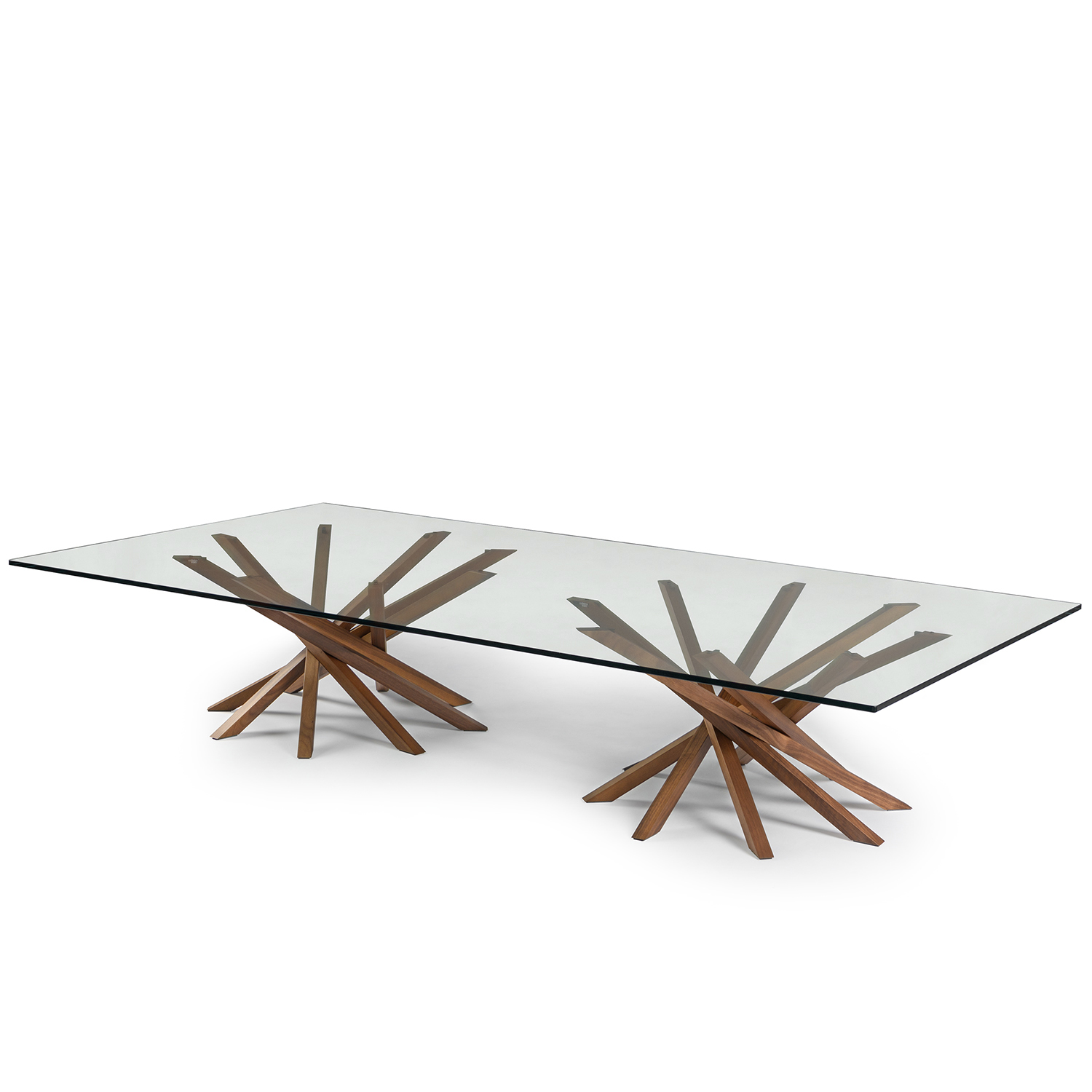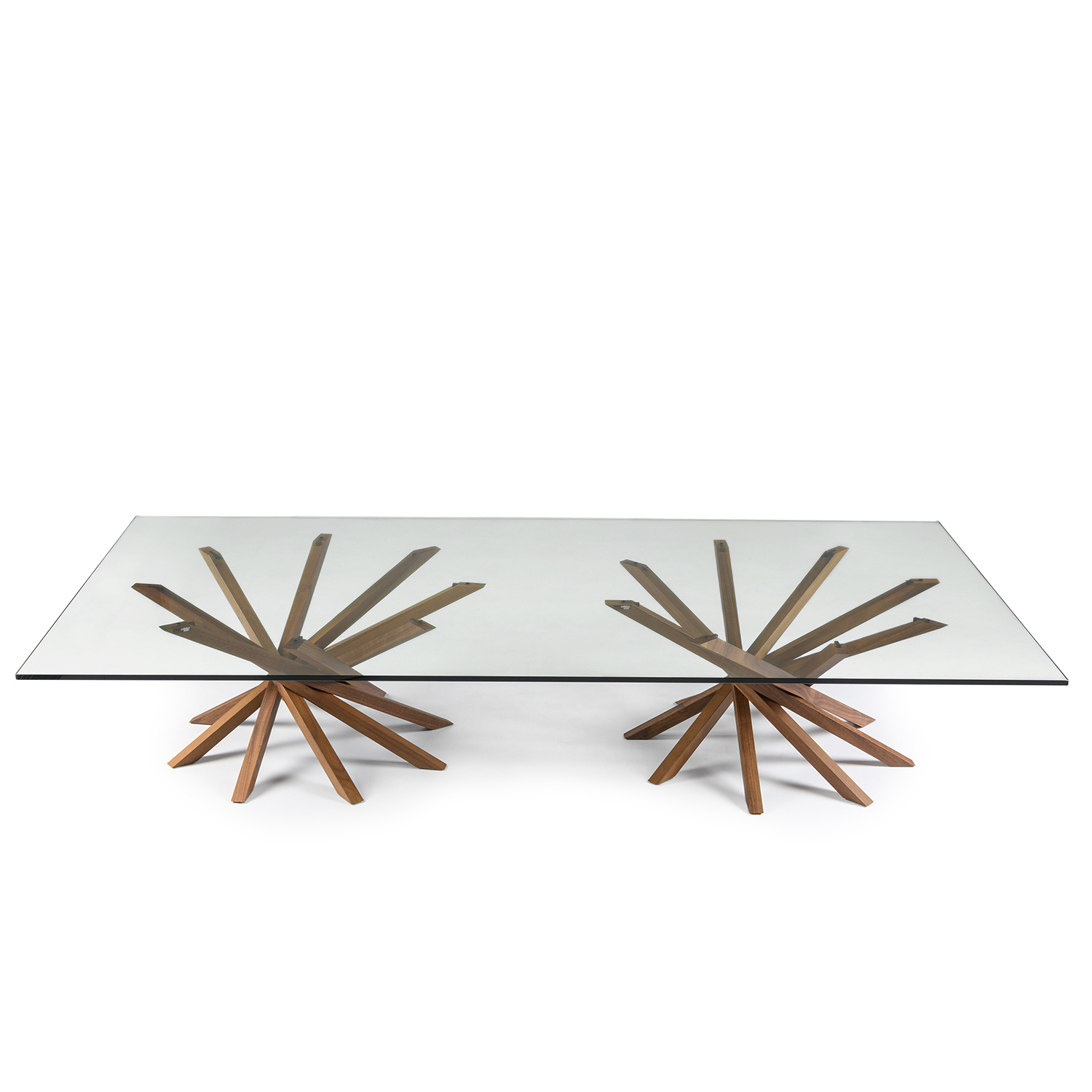 The Atari XL Coffee Table, made in Italy, represents the best of Italian design by seamlessly merging form and function. Atari has a smooth walnut base with two star-like groupings of eight legs, forming a one-of-a-kind look. A rectangular glass top adds a sense of lightness and lets you admire the base from any angle. Fine Italian craftsmanship and design unite in one sculptural coffee table.