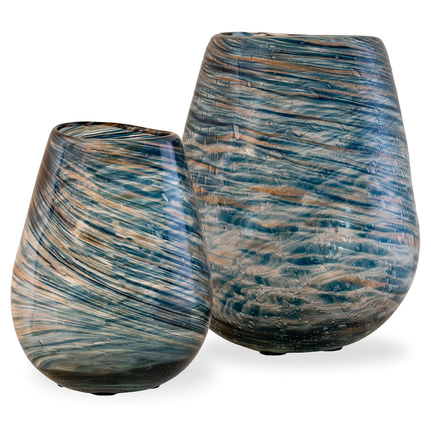[0] => The Aurora Swirl Vases are crafted from clear bubble glass with a delicate swirled pattern in blue and gold that will add refined tranquility to any room. Sold as a set of 2 with one larger vase and one smaller vase, each piece has a rounded teardrop shape and wide mouth that easily lets it hold a bouquet of flowers.