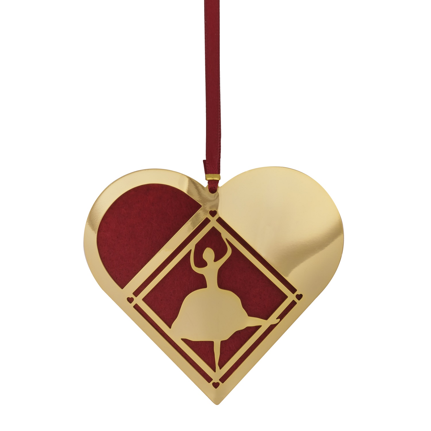 Bring Danish charm to your home for the holidays with the Ballerina Heart Ornament. Made of 18-karat gold-plated brass with a polished shine and delicate cut-out sections, this ornament is based off a design by Hans Christian Andersen and recalls his fairytale "The Steadfast Tin Soldier." This ornament has an open top that lets it carry a small trinket, candy, or sprig of greenery, and comes with a red felt lining and red ribbon for hanging.