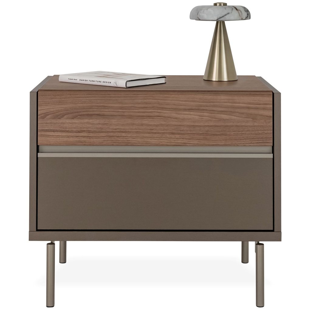 Understated and elegant, the Bella Borgata Nightstand will refresh your space with its light, airy design, earthy tones, and modern accents. Made in Italy, the nightstand has a tabletop and upper drawer finished in warm, eco-veneer walnut, with sides and a lower drawer in smooth matte bronze. The drawers are soft close and have integrated pulls for easy access to your nighttime essentials, plus an interior in textured dark grey wood. Slim bronze metal legs add a burnished metal accent and modern look. Cozy, woodsy, and warm, the Bella Borgata bedroom collection invites you to embrace true relaxation.