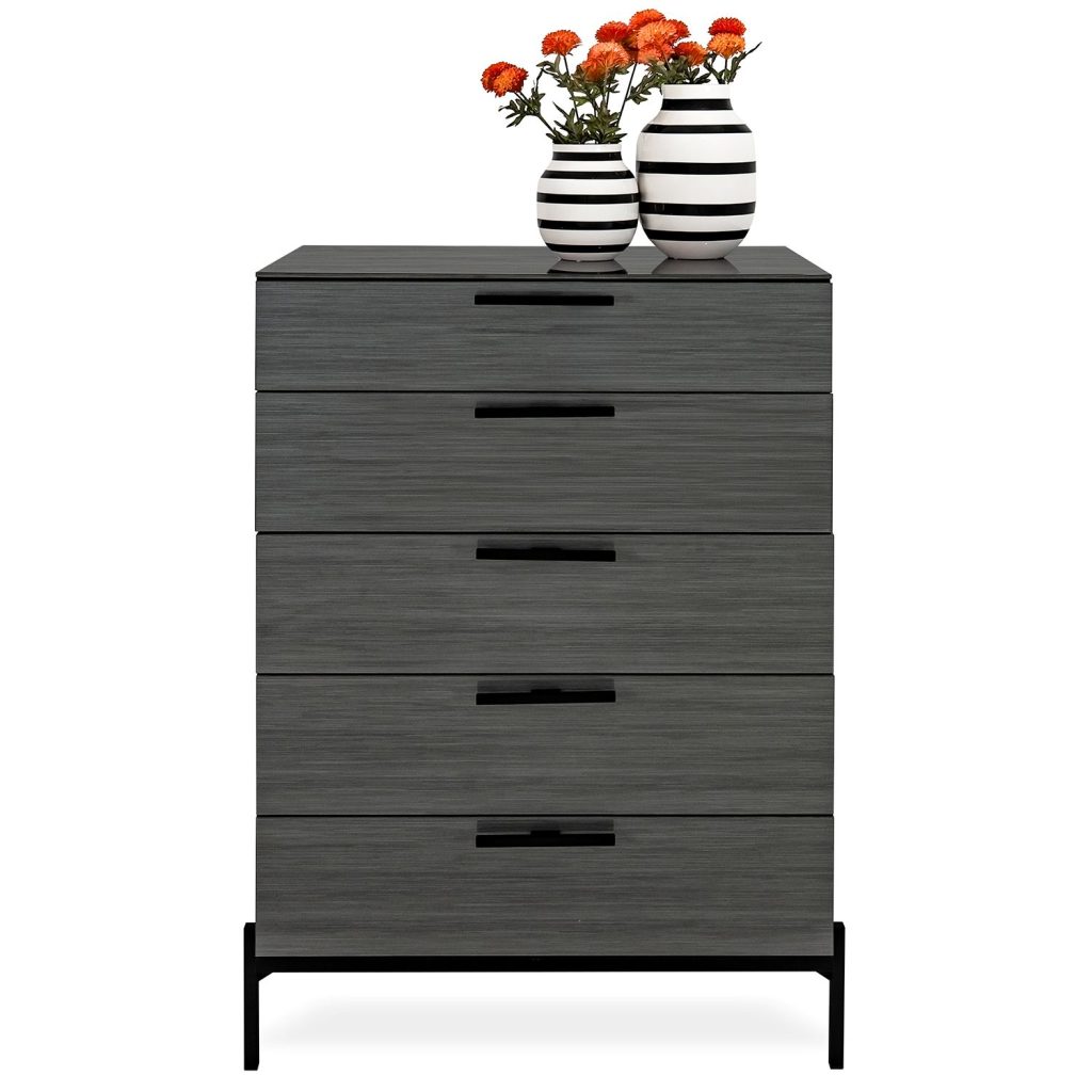 The Bella Centro High Chest features sleek, clean lines and a classic design. The glossy grey silverwood base is accented by matte black handles and legs, adding a sophisticated, cool-toned look. Five drawers provide ample storage space for your clothes and accessories, while the elegant frame brings timeless style into your bedroom.