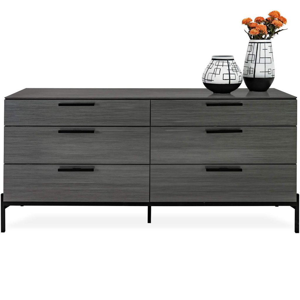 The Bella Centro Dresser features sleek, clean lines and a classic design. The glossy grey silverwood base is accented by matte black handles and legs, adding a sophisticated, cool-toned look. Six drawers provide ample storage space for your clothes and accessories, while the elegant frame brings timeless style into your bedroom.