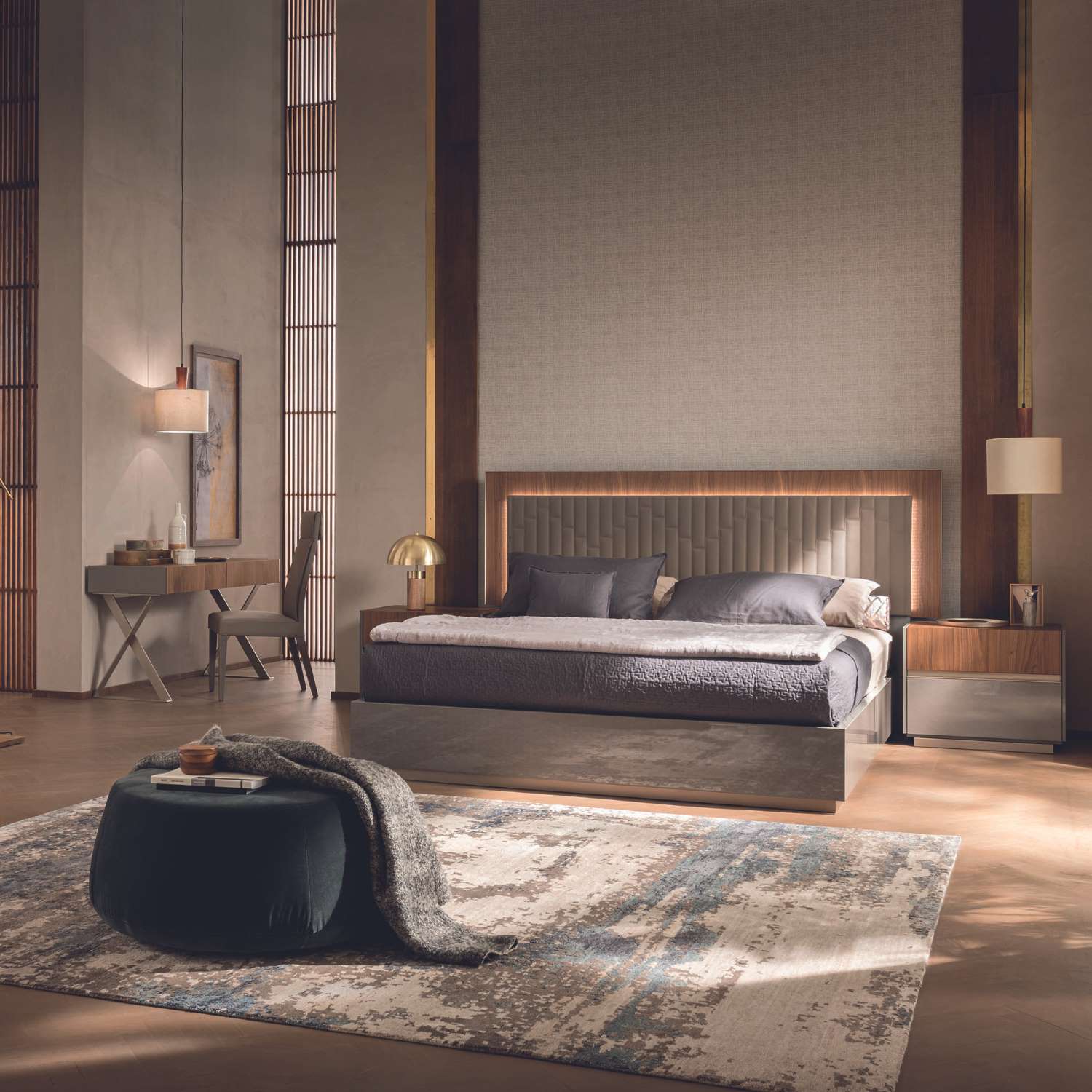 Full of earth-toned hues and comfortable accents, the Bella Clara Queen Bed is a contemporary haven for resting and relaxing. Bella Clara has a tiered headboard featuring a back panel of laser-cut walnut wood with a rippled effect and a front panel upholstered in beige "eco"-leather with stitched rectangles in a zigzag pattern. A lower frame with a grey high-gloss lacquer adds style and shine, while LEDs between the headboard panels offer mood lighting for a cozy ambiance.