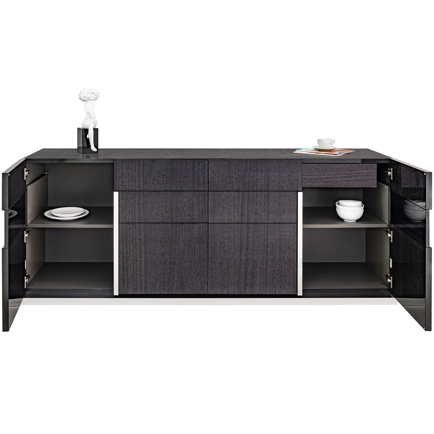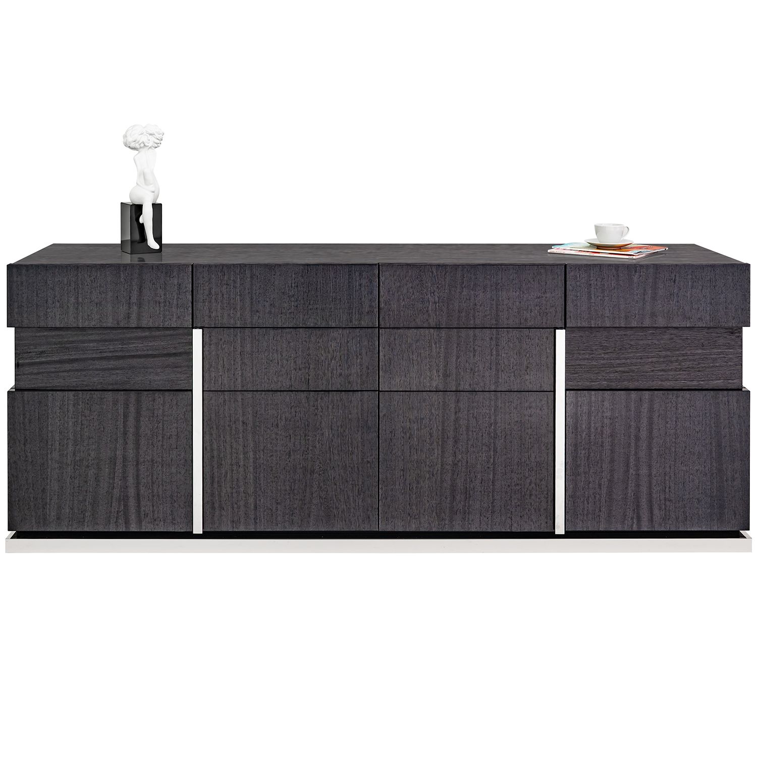 The Bella Grigio buffet, made in Italy, is an elegant buffet cabinet in high gloss grey koto wood. The buffet has four doors and ample storage for dishes, serveware, and linens.