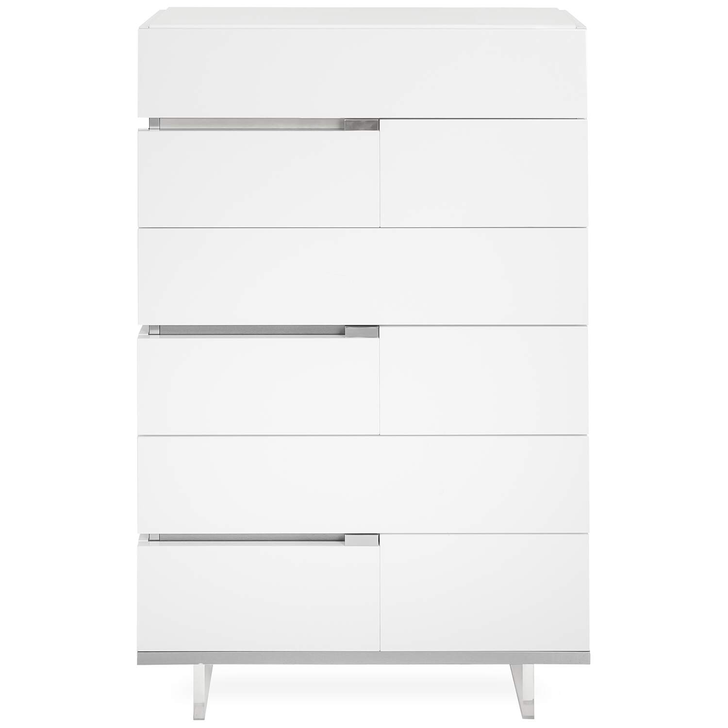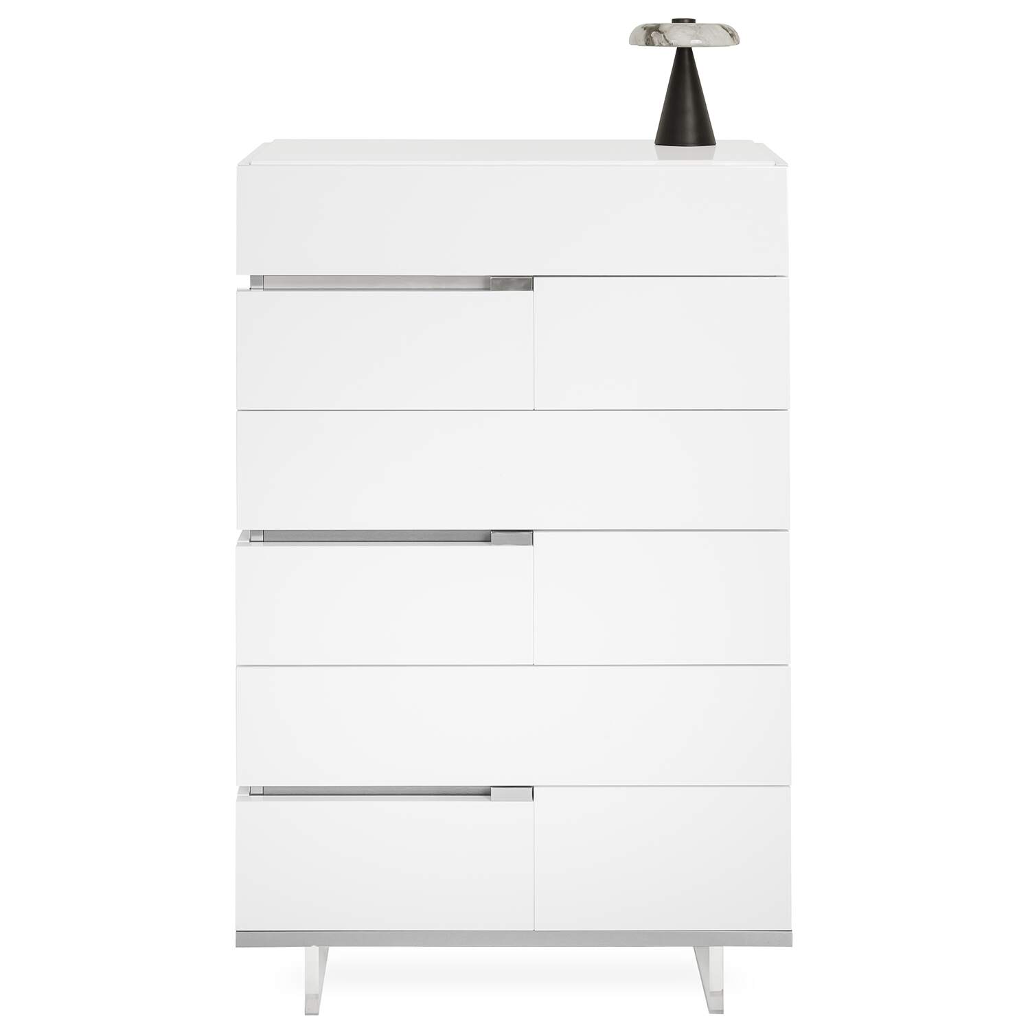 The Bella Vita high chest, made in Italy, captures the eye with its crisp geometric lines and white high gloss finish. Bella Vita brings bright, clean, and refreshing design to your bedroom space and is at once contemporary and timeless. This chest has six spacious drawers and attractive metal accents.