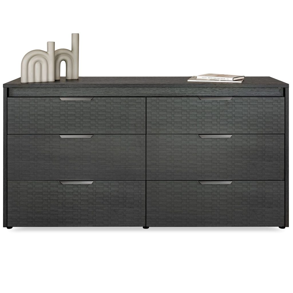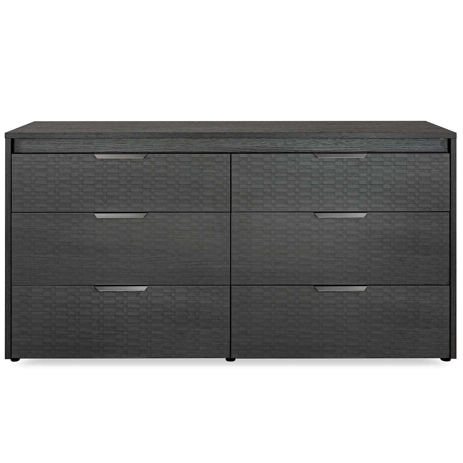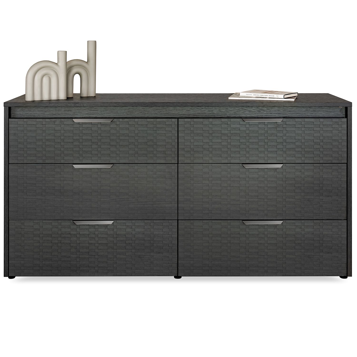 Made in Italy, the Bellezza 6-Drawer Dresser features distinctive Tetris-textured drawer fronts that accentuate its bold, variegated appearance, framed by a smooth eco dark oak finish. Offering a balance of design and everyday function, the dresser includes six spacious, soft-close drawers. LED lighting highlights each detail with a warm, ambient glow, adding a calming atmosphere ideal for winding down in a modern bedroom.