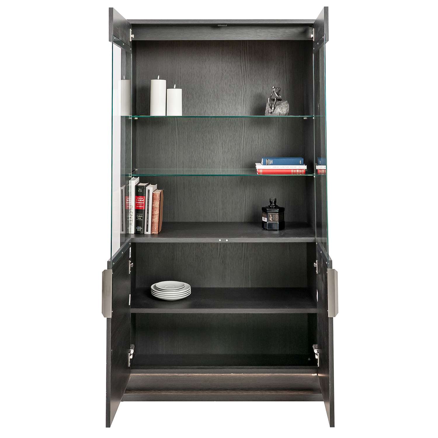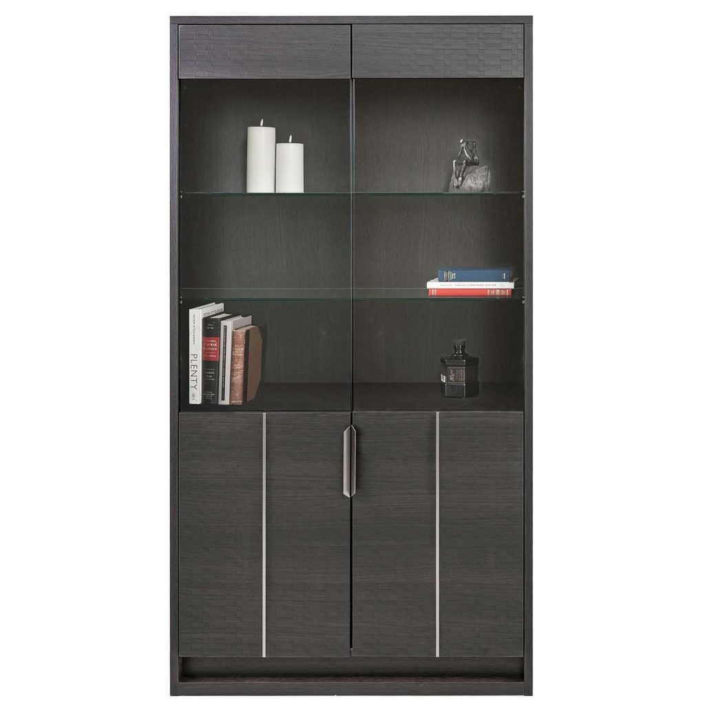 [0] => Designed in Italy, the Bellezza Curio Cabinet offers you a refined way to display decor and personal treasures. Boasting an eco dark oak finish, Bellezza's upper display section features two glass shelves, accented with Tetris-textured matte panels and integrated lighting that highlights items with a warm, ambient glow. A lower enclosed section with silver metal handles and a single interior shelf provides additional storage, balancing display and function within a clean, modern silhouette.