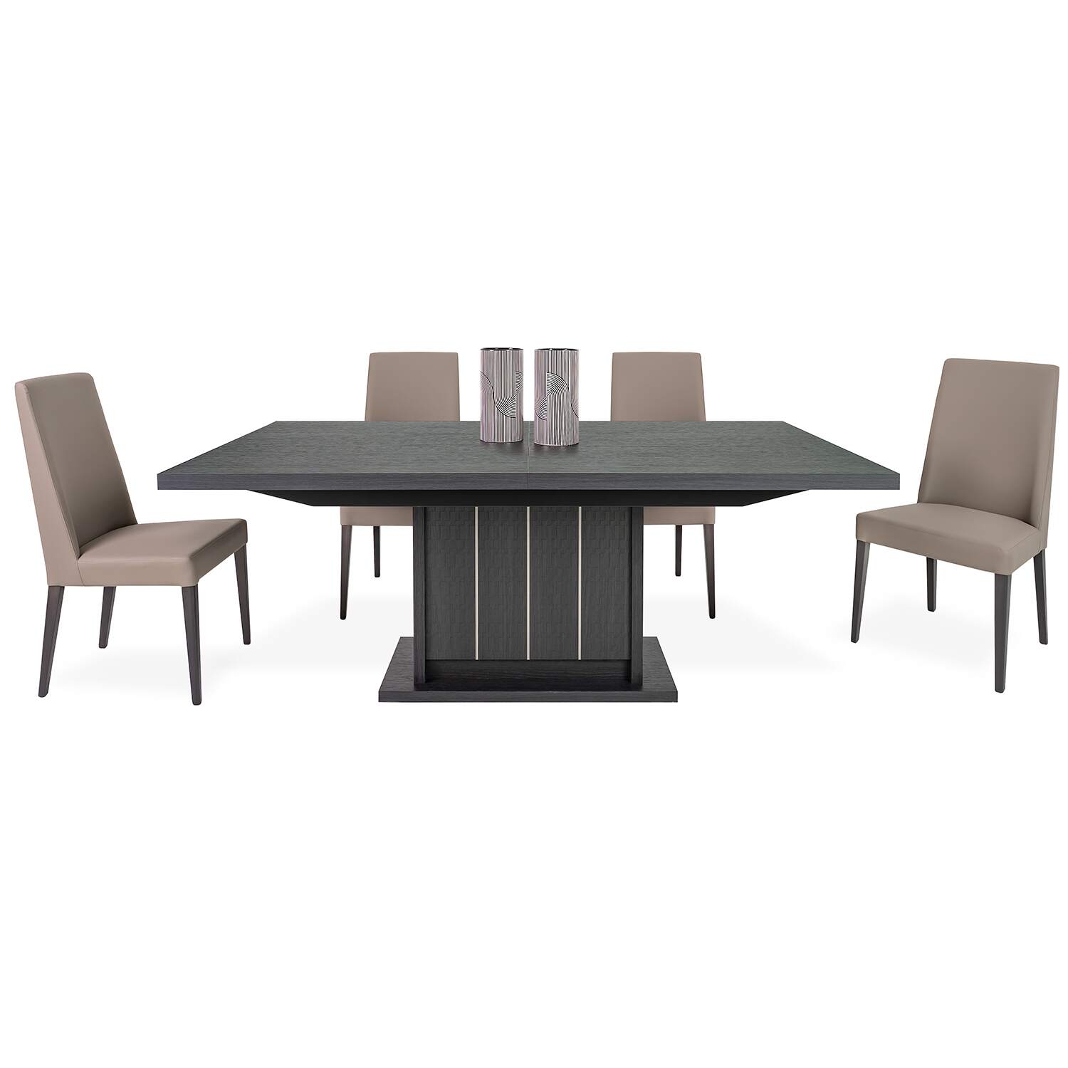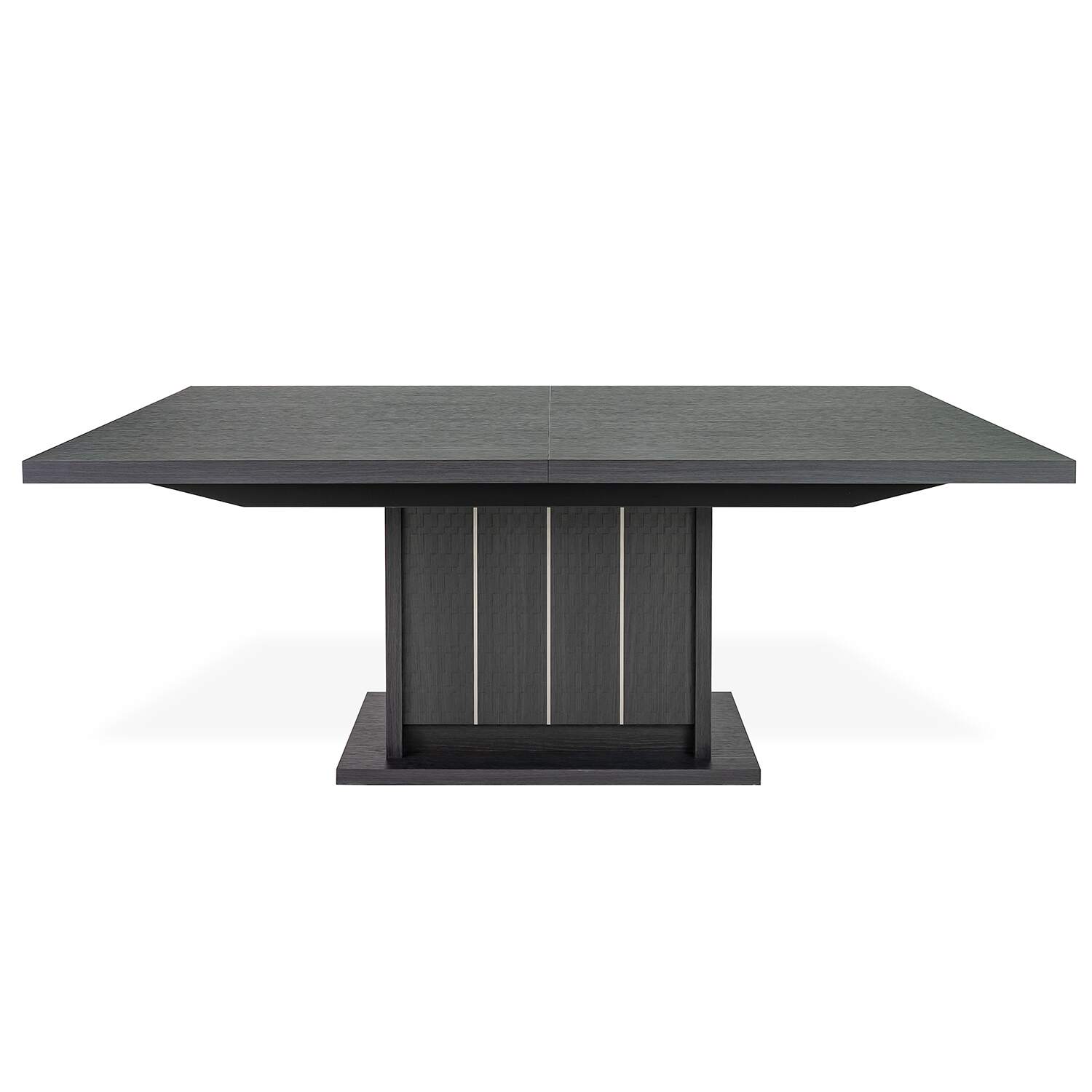 Make Italian design the centerpiece of your dining room with the Bellezza Dining Table. Bellezza's eco dark oak tabletop offers a smooth, refined surface and its sculptural base features Tetris-textured matte panels and silver metal accents for added depth and visual interest. A self-storing extension leaf creates room for up to eight diners while creating a sleek look with its contrasting grain pattern.