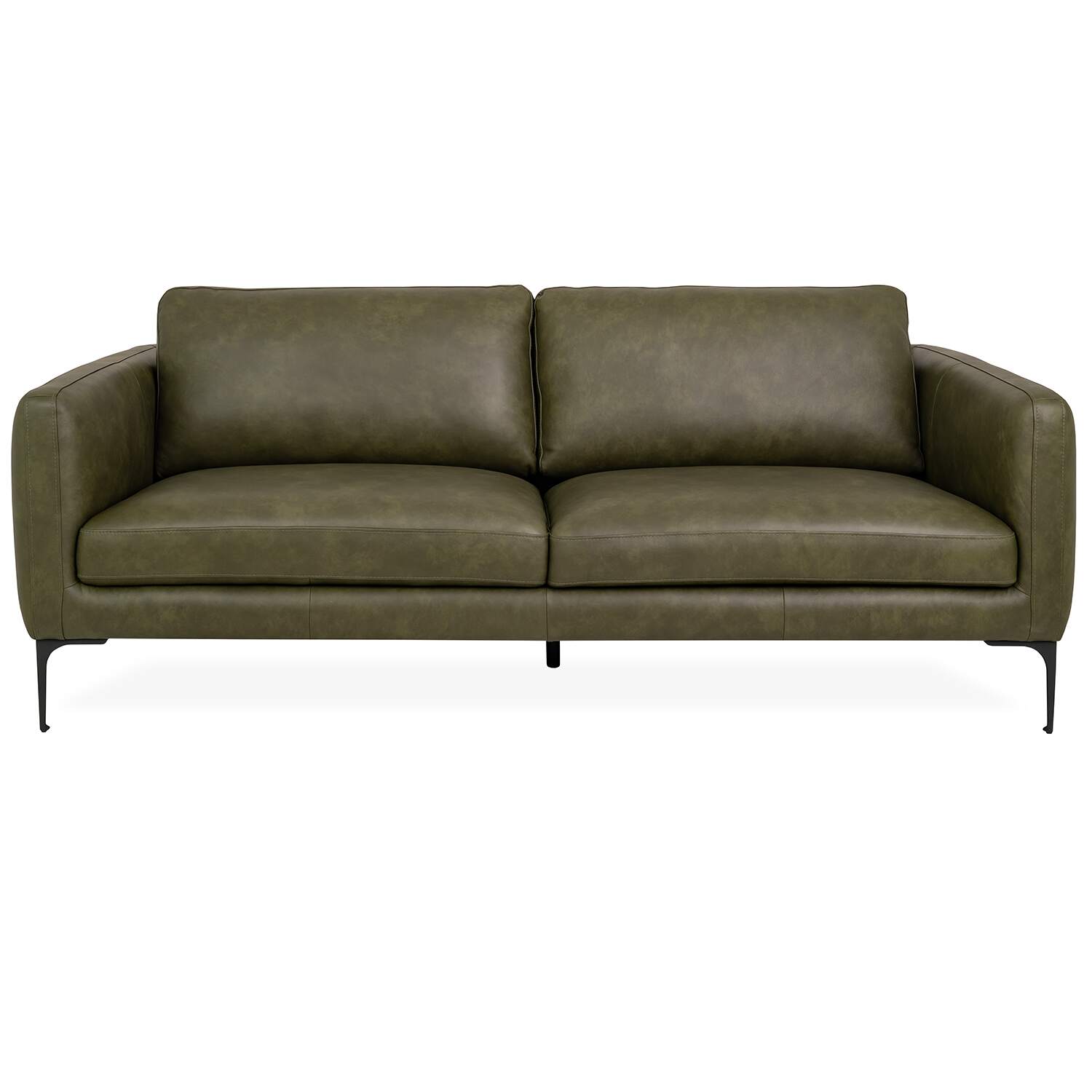 Upholstered in evergreen leather, the Blios Sofa features soft cushions and stylish tufting along its back and sides. The back cushions are mounted with Velcro for easy removal, while the matte black metal legs have a slim shape that forms a contrast with the sofa's fuller profile. With its classic look and deep color, Blios will complement a variety of interiors both traditional and modern.