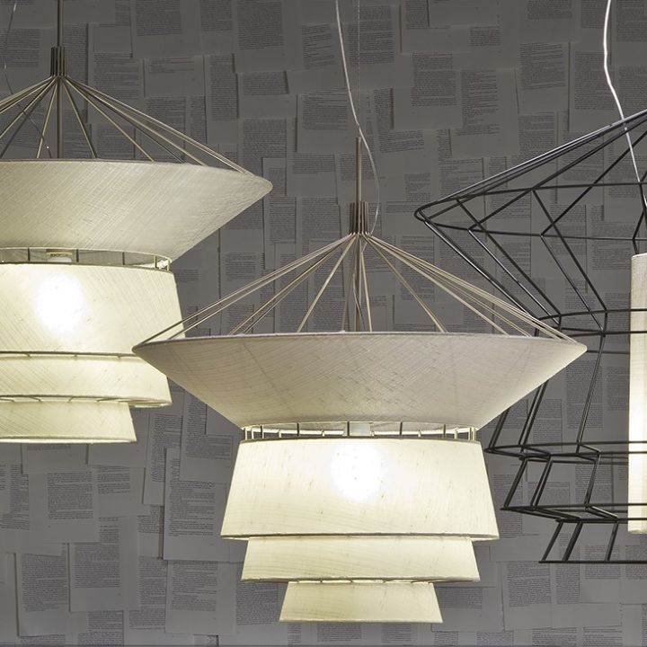 Bring chic industrial style to your living or dining space with the Bolero Pendant Lamp, designed by Oriano Favaretto and made in Italy. Bolero has an ivory shade with a striking nested design, coupled with a matte black frame that emphasizes its bold geometric lines.