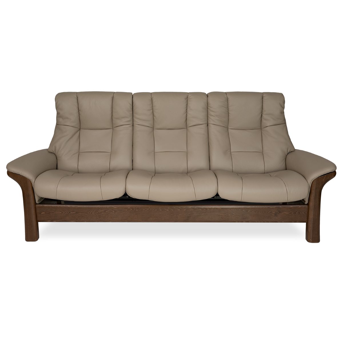 The Buckingham 3-Seat High Back Sofa, by Stressless® of Norway, features gentle curves and comfortably padded seats and armrests, with a walnut wood frame and Cori Special beige leather. Buckingham is equipped with Stressless® Plus™ and Glide Systems, which let the sofa provide continuous support for the head and lower back, while also adjusting the reclining angle of each individual seat based on shifts of the body. Sleek and comfortable, Buckingham invites you to sit back and relax in this classic design.