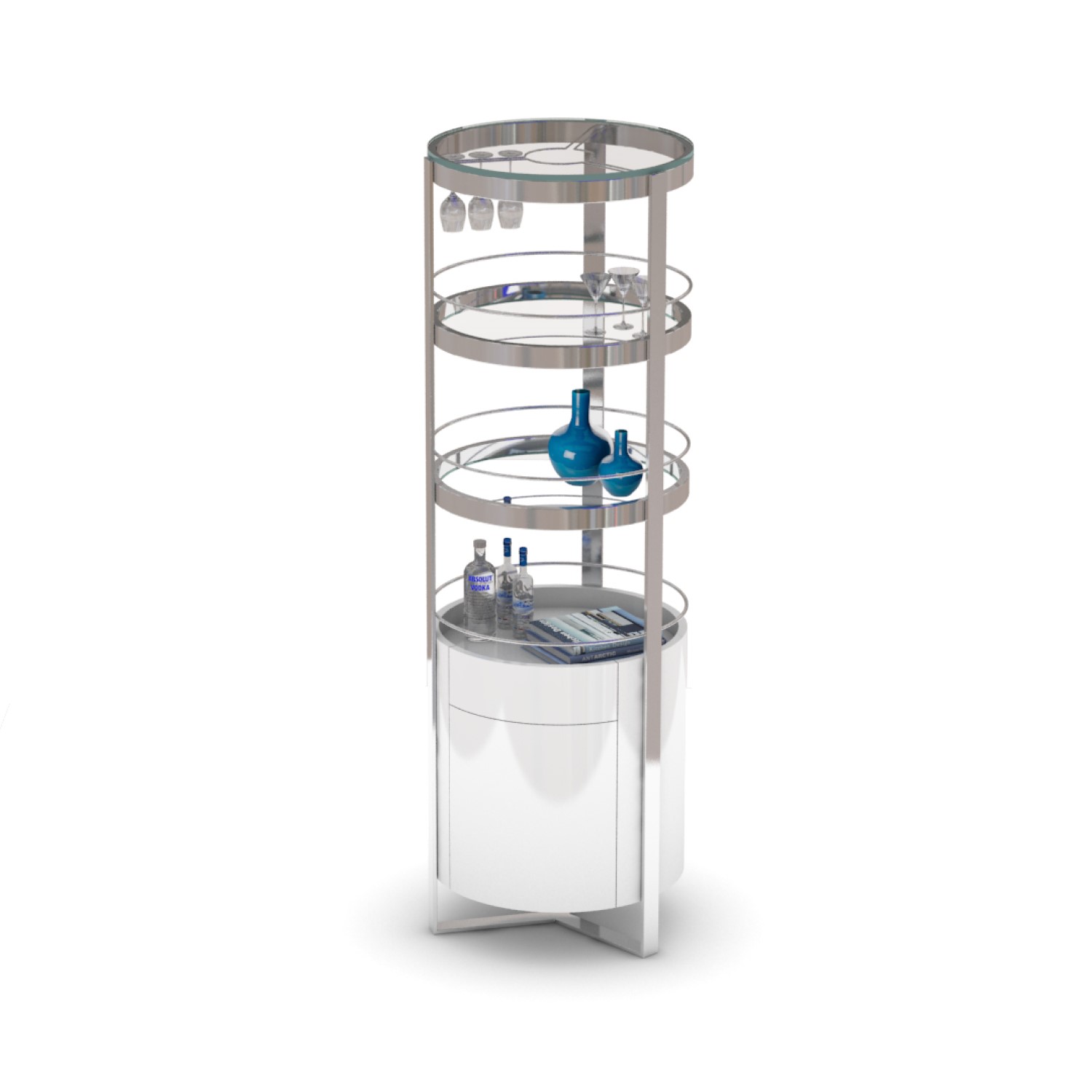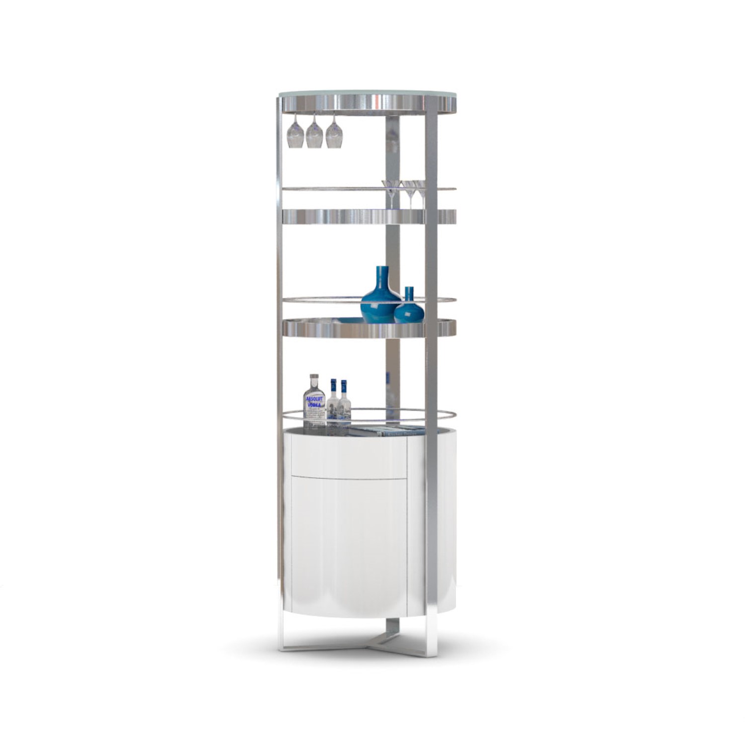[0] => Entertain in style with the Calypso Bar Tower, available with a glossy white finish and an open, three-tiered circular design. Featuring a stemware rack, two glass upper shelves, and a mirrored bottom shelf, Calypso is perfect for storing your bar essentials and displaying your favorite accessories and glasses. The round wood framed base, with one drawer and one cabinet, is supported by an angular steel structure, creating a suspended, floating effect that adds to the contemporary vibe of this bar tower.