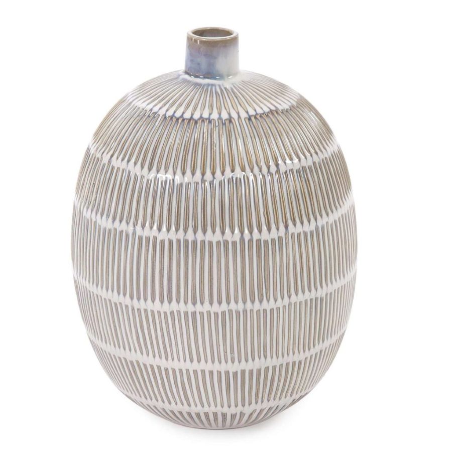 [0] => Made from ceramic, the Caramel Cream Ridge Large Vase presents a blend of neutral tones and striking texture that will add an earthy touch to any interior. This cream-colored vase is adorned with lines of caramel brown ridged detailing and finished with a glossy glaze. The oval-shaped body is topped by a short, slender neck with a subtle color accent in dusty blue that further adds visual interest.
