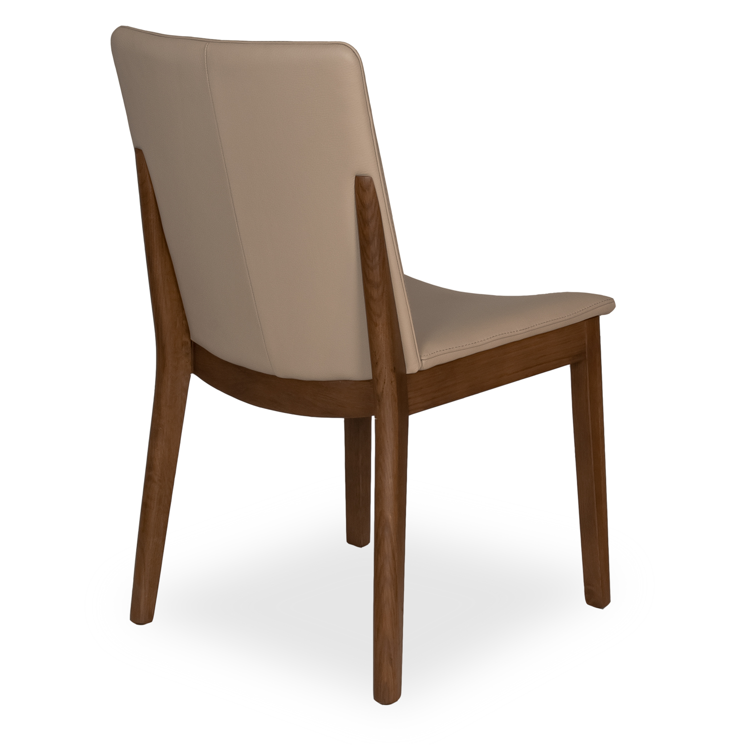 The Caroline Dining Chair features soft leather upholstery with a light mocha hue and walnut legs that extend partway up the backrest for a distinctive look. A curved and padded seat ensures your comfort, while the round legs, smooth corners, and tailored stitching create a pleasing and elegant impression. Caroline is a modern classic, perfect for a wide variety of design environments.