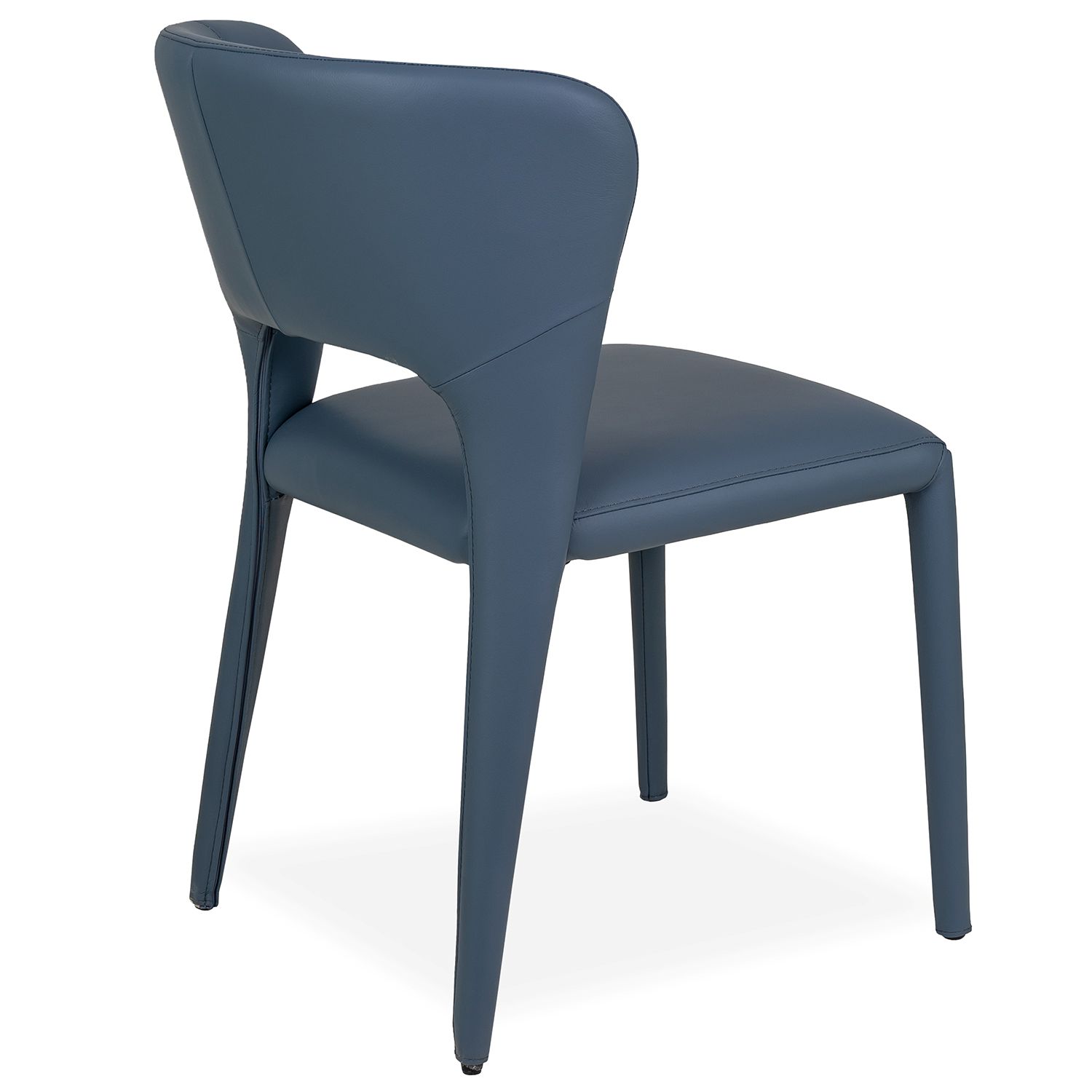 Bring artful elegance to your dining space with the Celine Dining Chair. Featuring a winged backrest that cradles your body as you sit, Celine is clad in blue leather with fully upholstered legs for a soft and luxurious look. The backrest smoothly transitions into the back legs, creating a unified, sculptural shape that is further enhanced by tailored seams and a striking cutout that plays with negative space. Refined and modern, Celine turns any meal into a fine dining experience.