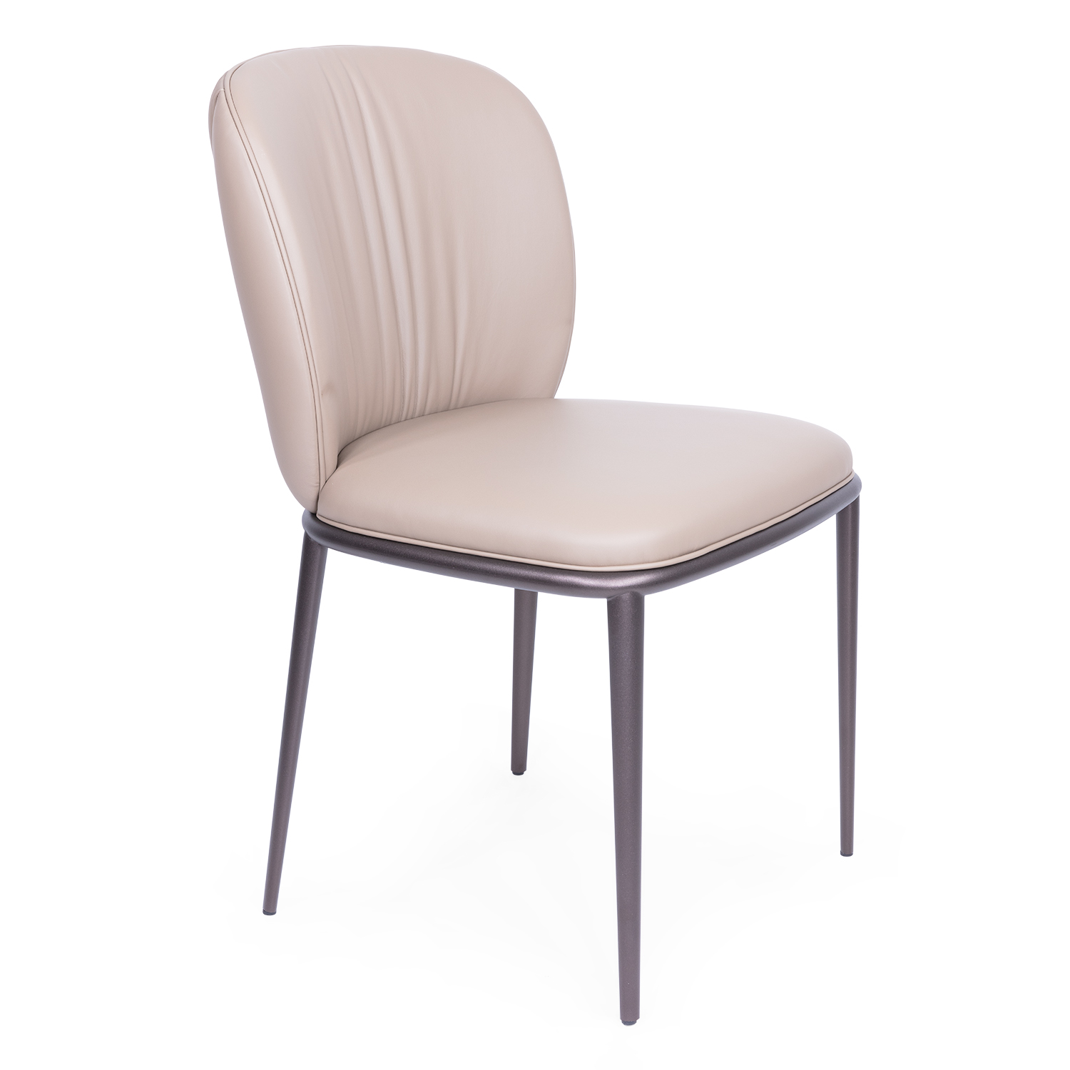 [0] => The Chrishell Side Chair, by Cattelan Italia, features clean lines and elegant style, highlighted by the soft taupe leather and the bronze metal frame. The curved seat back has a seashell-like effect, with vertical detail stitching that emphasizes the curves and ribs of the design. The slim legs provide a subtle contrast against the wide seat cushion and soft leather.
