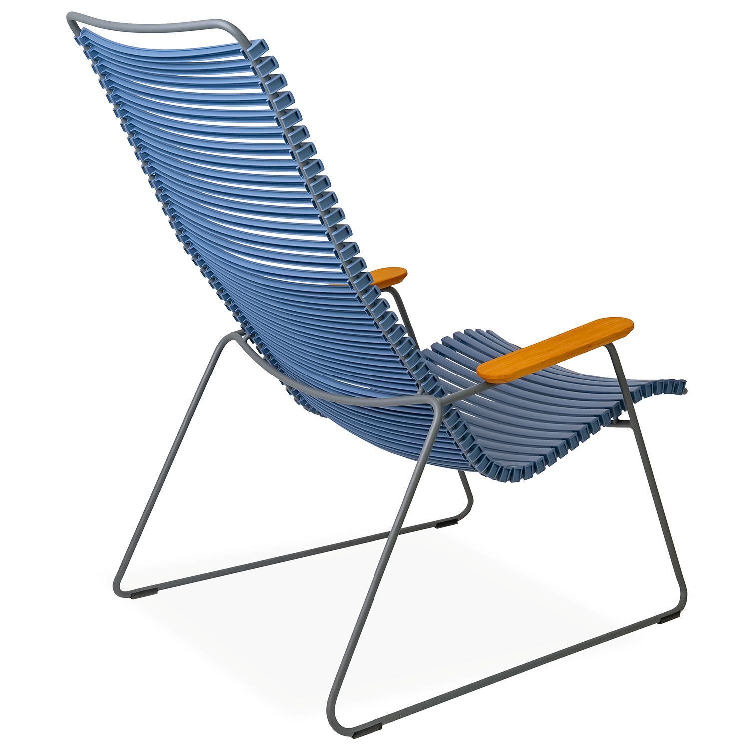 Embrace outdoor relaxation with the Click Lounge Chair, designed in Denmark. Click features a striking, ergonomic form that provides sturdy and stylish cushion-free comfort by the pool, on the patio, or in the living room. Suitable for use indoors and out, Click is made with UV-protected plastic lamellas (slats) in pigeon blue, supported by a grey powder-coated steel frame. Bamboo armrests add a touch of intrigue and texture to the slatted body and metal frame, which appear to form the chair's structure in one fluid motion. The plastic lamellas can be clicked on and off to be replaced or to modify its look, taking Danish modern design to the next level.