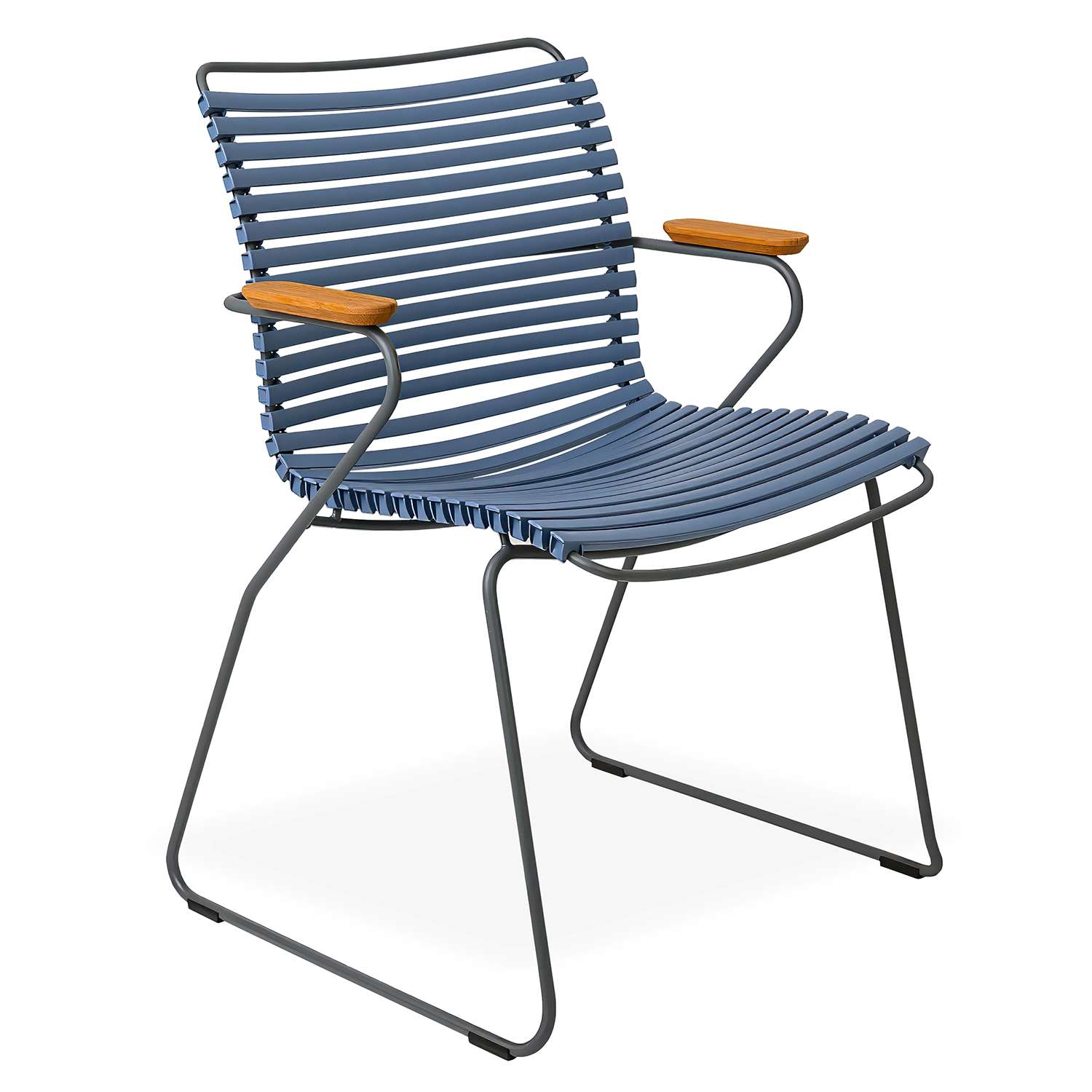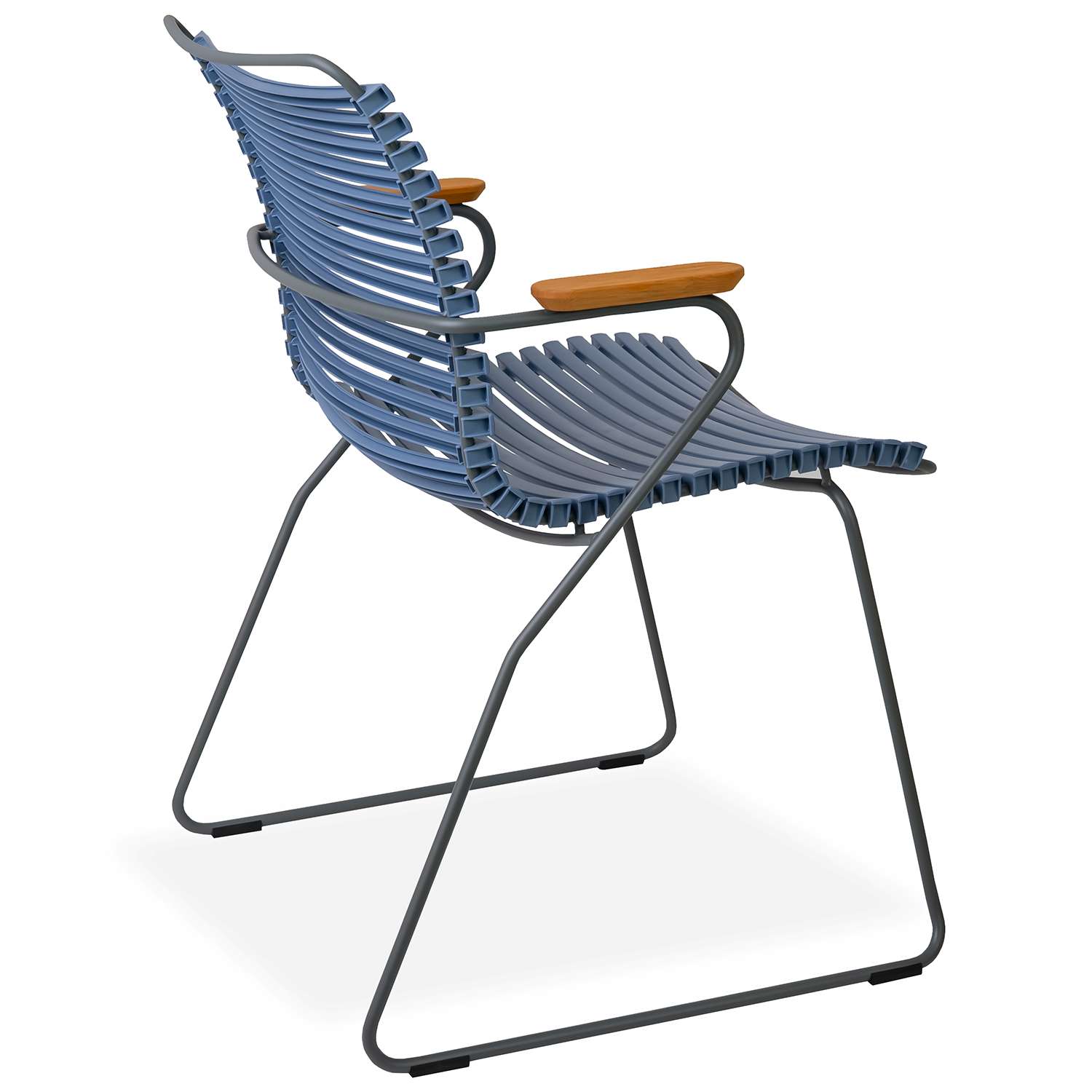 The Click Low Back Dining Armchair has a striking, ergonomic design that provides sturdy and stylish cushion-free comfort by the pool or dining table. Made with UV-protected plastic lamellas (slats), Click is suitable for use indoors and out and features a grey, powder-coated steel frame. Bamboo armrests add a touch of intrigue and texture to the slatted pigeon blue seat and grey frame, which appear to form the chair's structure in one fluid motion. Click's plastic lamellas can be clicked on and off to be replaced or to modify its look, taking Danish modern design to the next level.