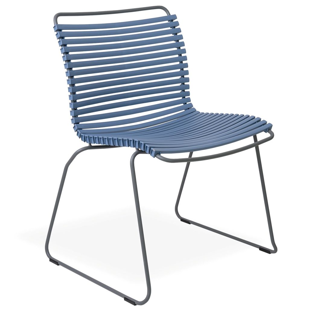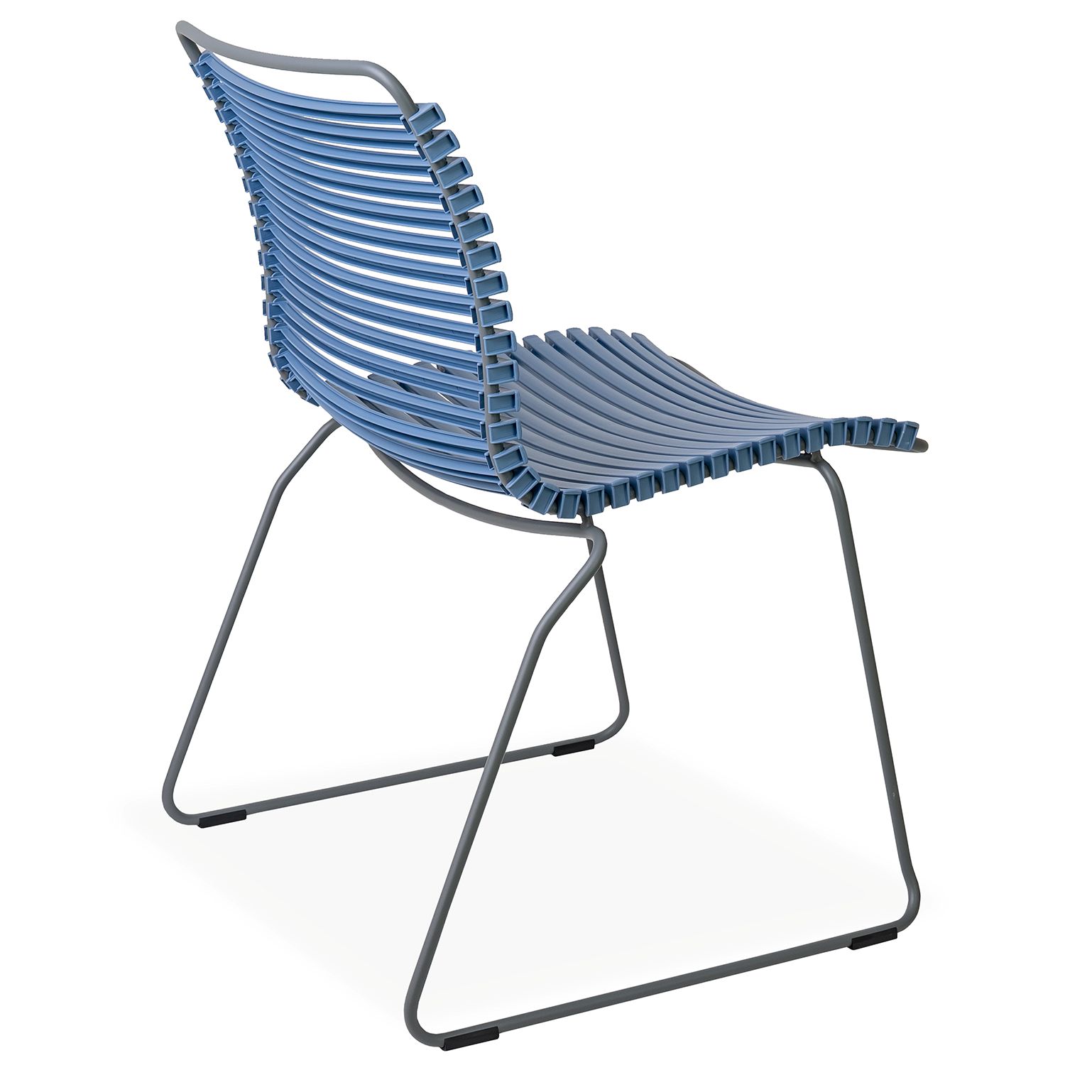 The Click Low Back Dining Chair has a striking, ergonomic design that provides sturdy and stylish cushion-free comfort by the pool or dining table. Suitable for use indoors and out, Click is made with UV-protected plastic lamellas (slats) in pigeon blue, supported by a grey powder-coated steel frame. Click's plastic lamellas can be clicked on and off to be replaced or to modify its look, taking Danish modern design to the next level.