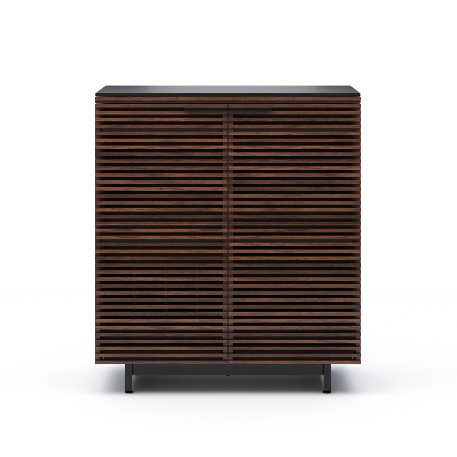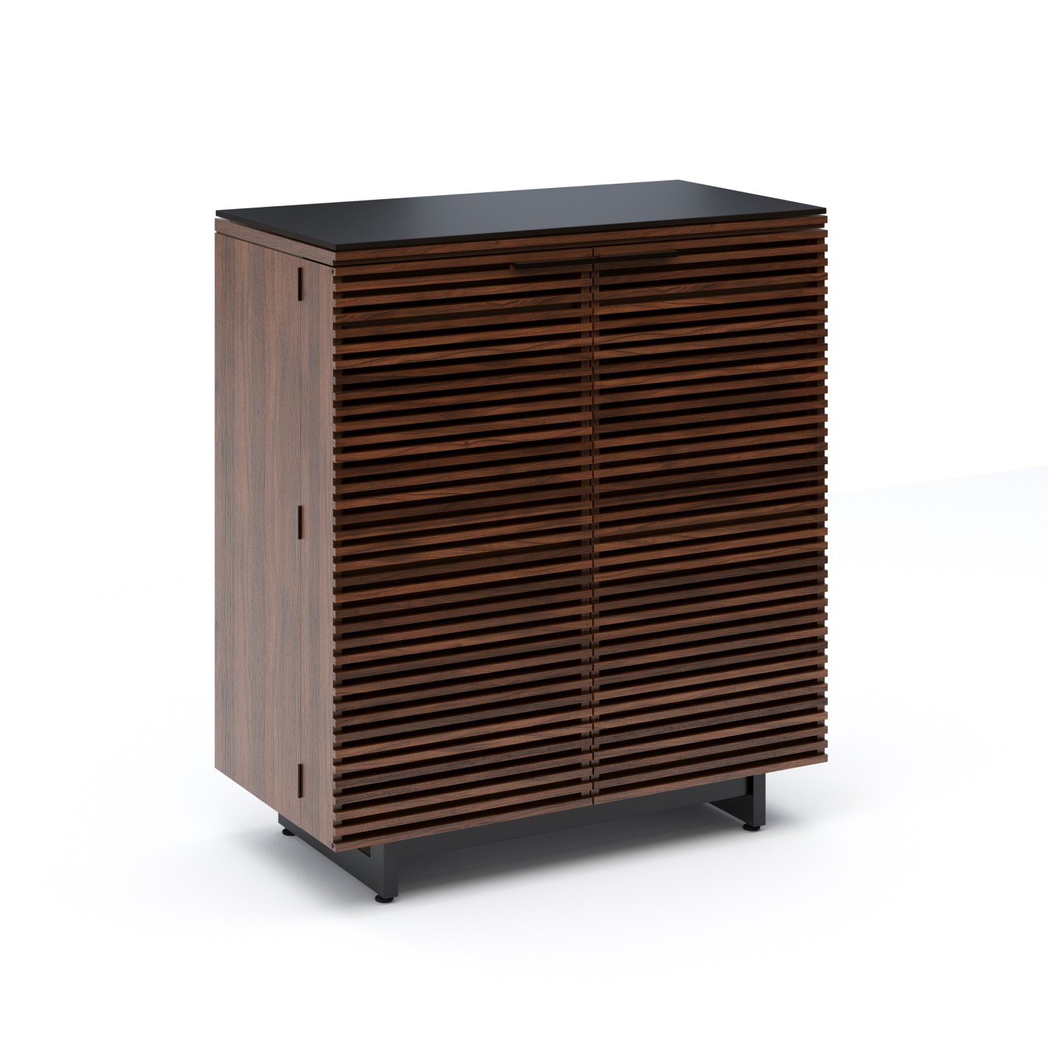 Available in chocolate-stained walnut, the Corridor Bar is beautiful, practical — and award winning. Recognized by the American Society of Furniture Designers for its innovative design, the Corridor Bar features stunning hardwood, powder coated steel, and a hard-wearing satin-etched glass top. The double doors are louvered to keep contents out of sight when not in use, but can be opened fully, revealing thoughtful details, including bottle storage, a stemware rack, and an adjustable shelf, that make staying organized easy.