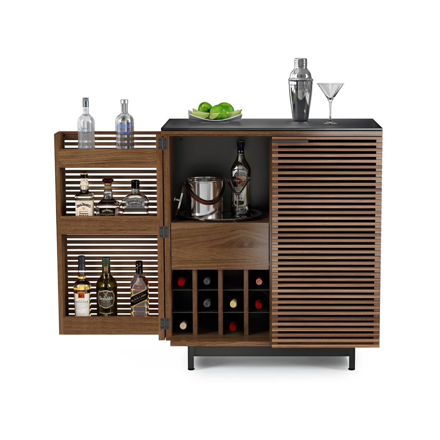 Available in natural walnut, the Corridor Bar is beautiful, practical — and award winning. Recognized by the American Society of Furniture Designers for its innovative design, the Corridor Bar features stunning hardwood, powder coated steel, and a hard-wearing satin-etched glass top. The double doors are louvered to keep contents out of sight when not in use, but can be opened fully, revealing thoughtful details, including bottle storage, a stemware rack, and an adjustable shelf, that make staying organized easy.