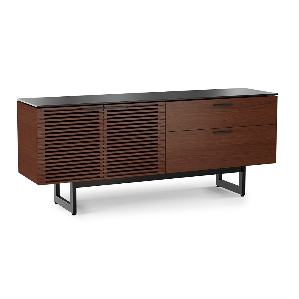 The Corridor Credenza was designed with the modern professional in mind. Featuring a soft yet durable satin-etched tempered glass top, chocolate walnut-stained wood, and powder-coated steel legs, Corridor's clean lines and refined styling is evident in every facet of its design. Louvered doors conceal a storage compartment with adjustable shelving, and two locking drawers provide space for letter- and legal-sized folders for easy organization.
