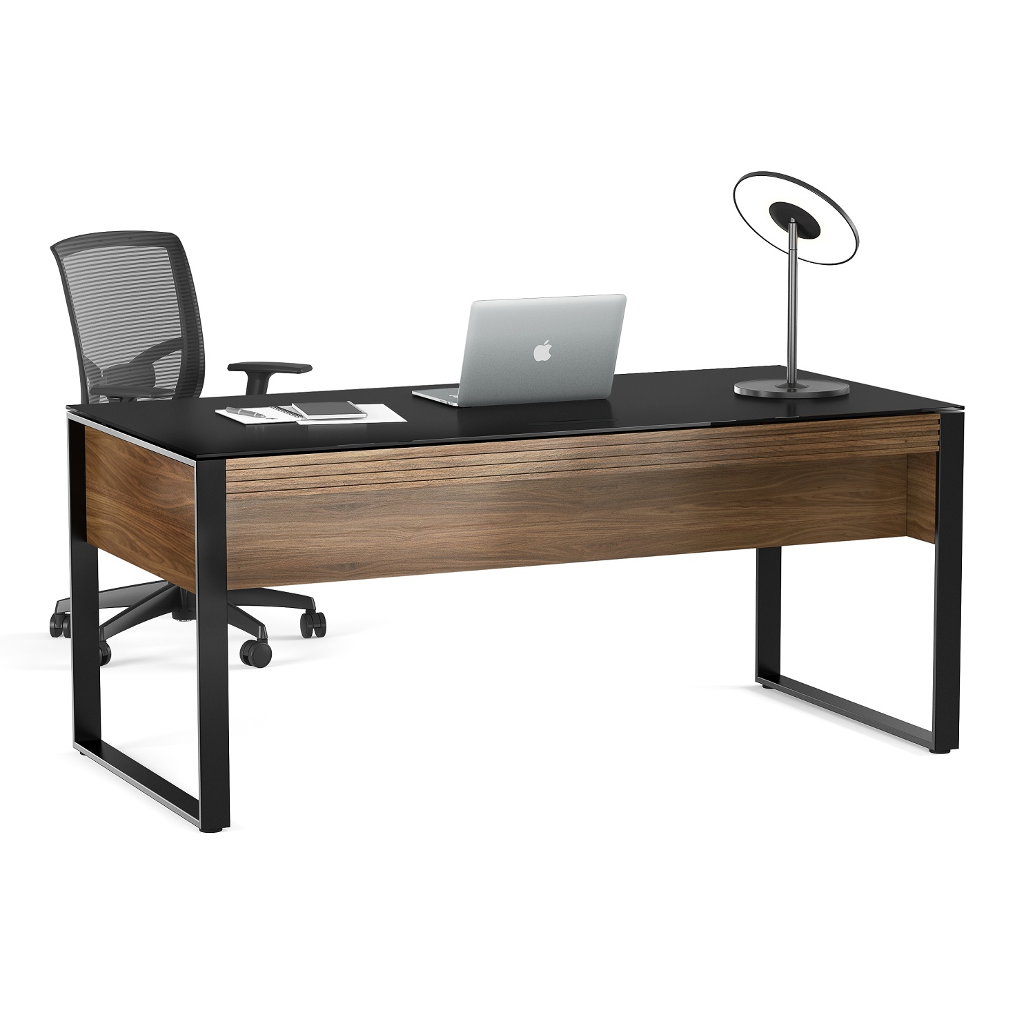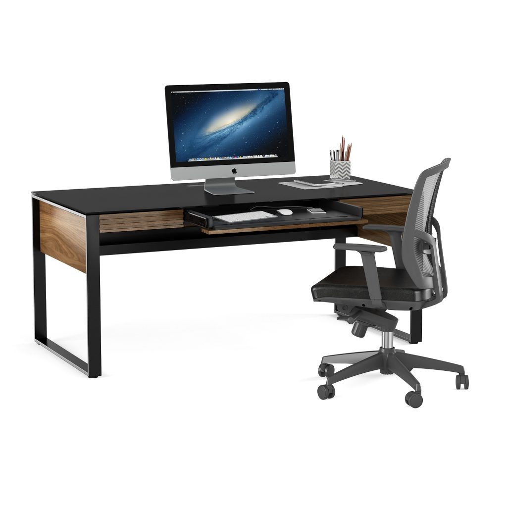 The Corridor Desk was designed with the modern professional in mind. Featuring a soft yet durable satin-etched tempered glass top, natural walnut-stained wood, and powder-coated steel legs, Corridor's clean lines and refined styling is evident in every facet of its design. Two storage drawers, cable management channels, and a flip-down keyboard drawer keep you organized, while the modesty panel means the desk can be placed anywhere in a room and is optimized for comfortable cross-desk collaboration.