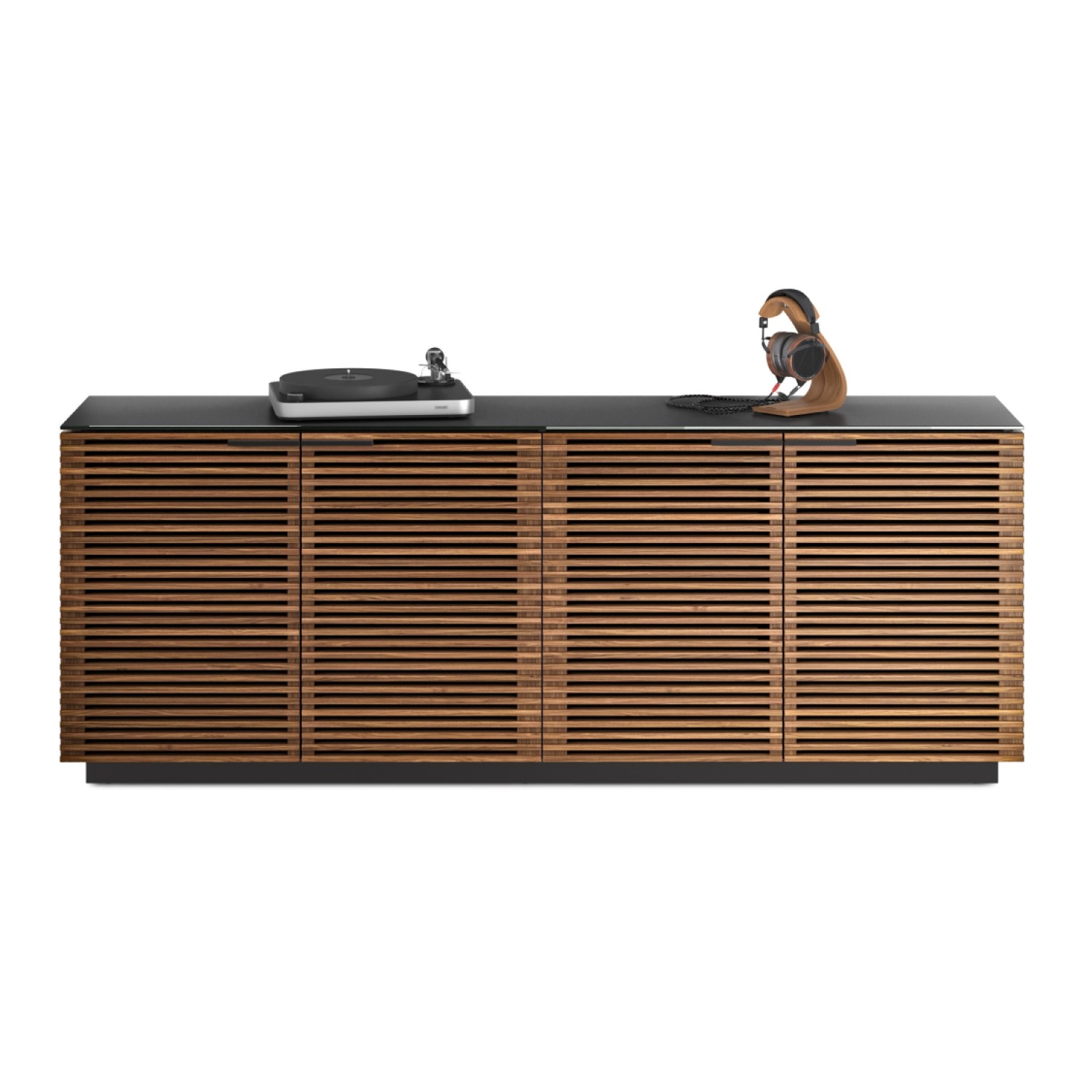 The Corridor Four Door Storage Cabinet by BDI is a large, contemporary credenza that forms part of the Corridor home collection. This versatile design can be used as a media console, dining buffet, or storage sideboard, with two adjustable glass shelves and two repositionable lined drawers allowing for ultimate customization. A durable, satin-etched tempered glass top complements the natural walnut wood frame, which highlights the elegance of its mid-century modern design, and integrated wire management ensures your stored items remain secure and organized