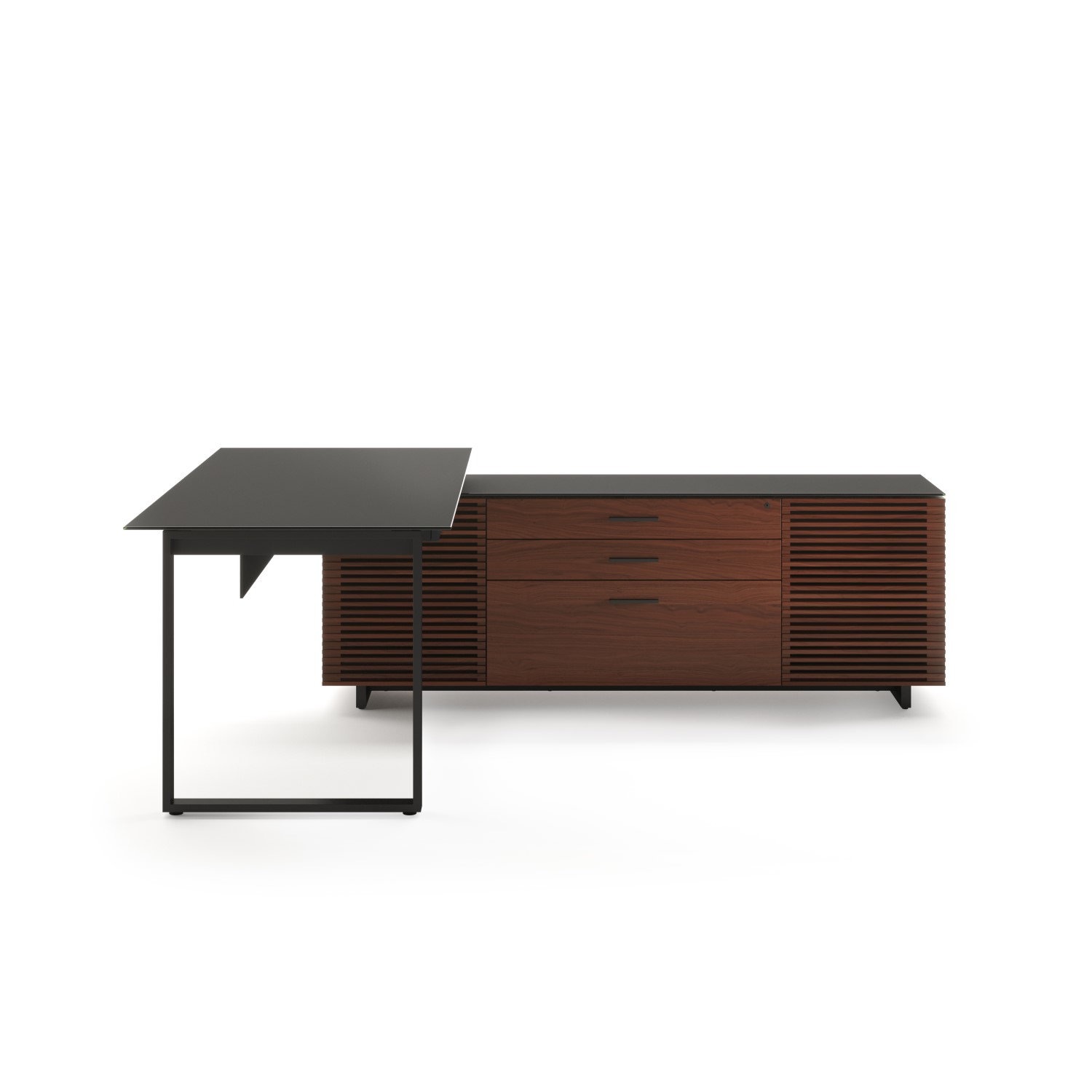 The Corridor L-Desk was designed with the modern professional in mind. Featuring a soft yet durable satin-etched tempered glass top, a chocolate-stained walnut wood finish, and powder-coated steel legs, Corridor's clean lines and refined styling is evident in every facet of its design. The desk features cable management channels and a nonslip, lined flip-down keyboard drawer with space to charge small devices. The storage unit has adjustable shelves, two locking storage drawers and a lateral file drawer that can accommodate letter and/or legal hanging files, a push-to-open printer tray, and ventilated louvered doors. The desk can be assembled on either the left or right side to suit your needs, and the modesty panel means the desk can be placed anywhere in a room and is optimized for comfortable cross-desk collaboration.