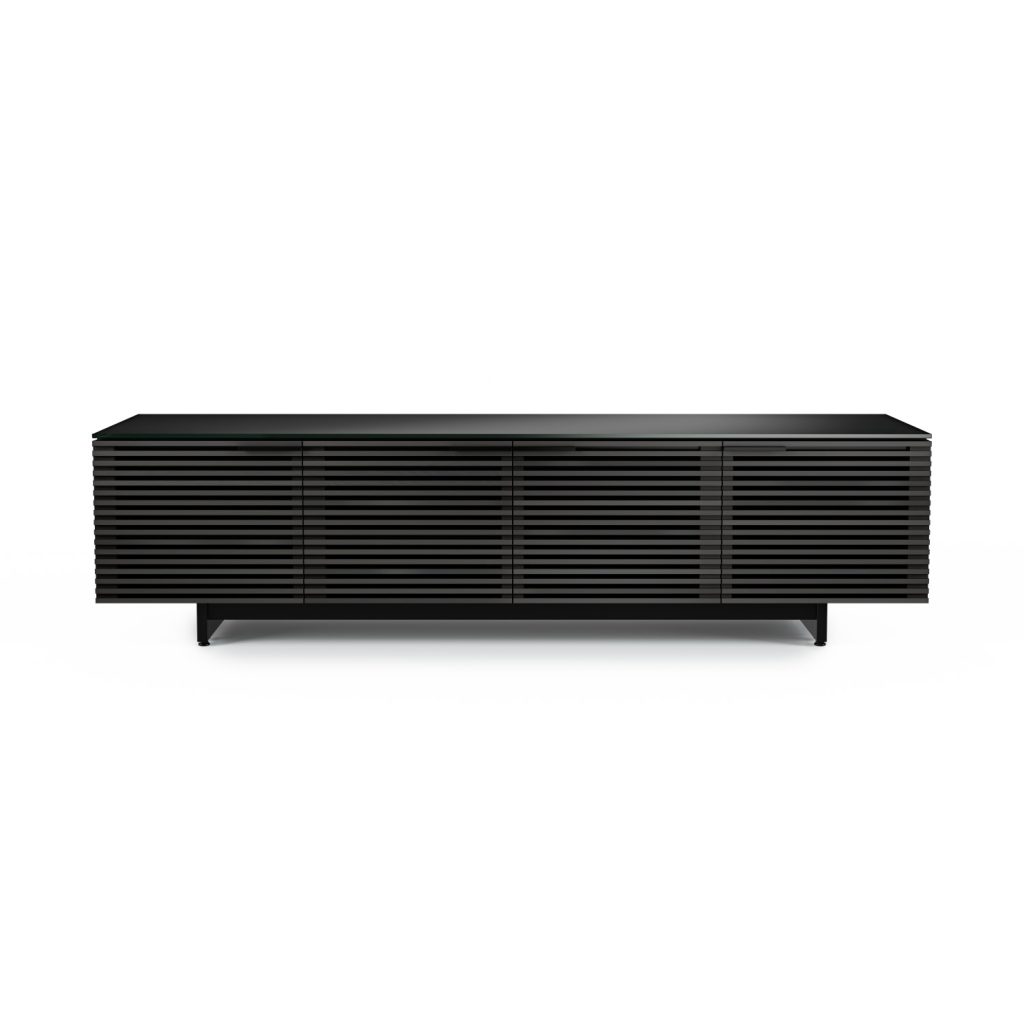 The Corridor Low TV Stand by BDI, available in charcoal-stained ash with a durable satin-etched tempered glass top, is a versatile media unit that forms part of the Corridor home collection. Featuring an integrated soundbar shelf, remote-friendly and acoustically-transparent louvered doors, built-in cable management, hidden wheels, and rear access panels, this TV stand has everything you need in an entertainment system. The Corridor Low TV Stand's low-profile design will maximize storage space while adding style to any room.